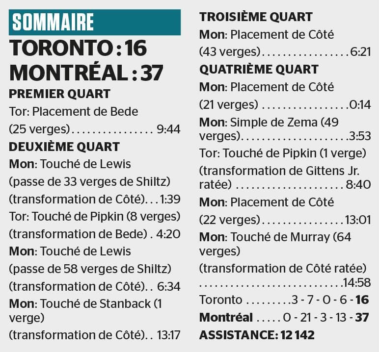 Montréal a explosé après 15 minutes sans histoire. Monshadrik Hunter a sonné la charge en retournant sur 12 verges une interception, puis Matthew Schiltz a trouvé Lewis profondément dans la zone des buts.