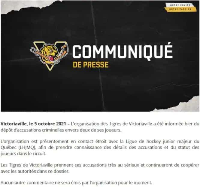 Le Journal a aussi tenté de s’entretenir avec le directeur général des Tigres Kevin Cloutier, ainsi que l’entraîneur-chef Carl Mallette, mais l’organisation nous a renvoyé à la déclaration officielle faite par l’équipe en matinée, mentionnant « prendre les accusations très au sérieux » et assurant qu’elle va continuer « de coopérer avec les autorités dans ce dossier. »