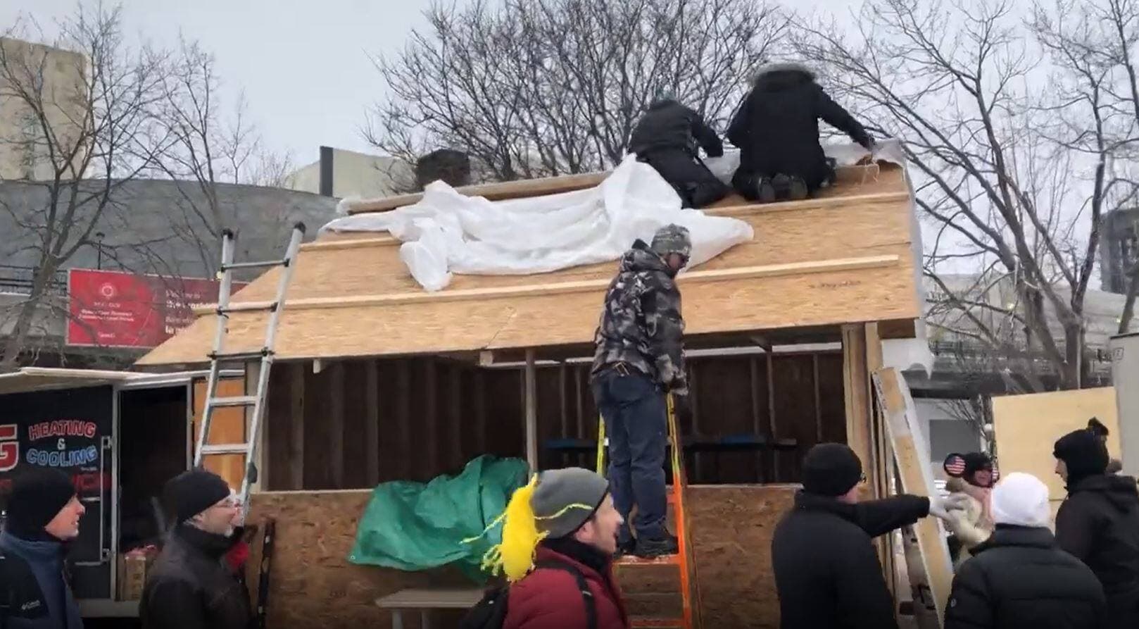 Cette construction a lieu dans un point de ravitaillement des manifestants en face de l’hôtel de ville de la capitale fédérale, où un véritable petit village s’est créé au sein même de la ville.