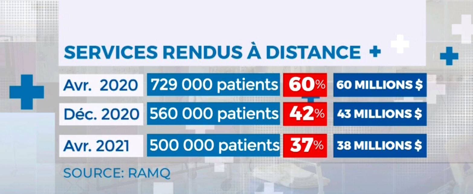 En avril 2020, les médecins de famille ont rejoint 729,000 patients par téléconsultation. C'était 60% de toutes les visites, et une facturation de 60 millions de dollars. Cela a diminué à 42%, en décembre 2020. Les dernières données disponibles et partielles indiquent que c'était 37%, en avril dernier. Cela s'expliquerait en partie par le fait que certains médecins âgés n'avaient pas reçu leur deuxième dose.