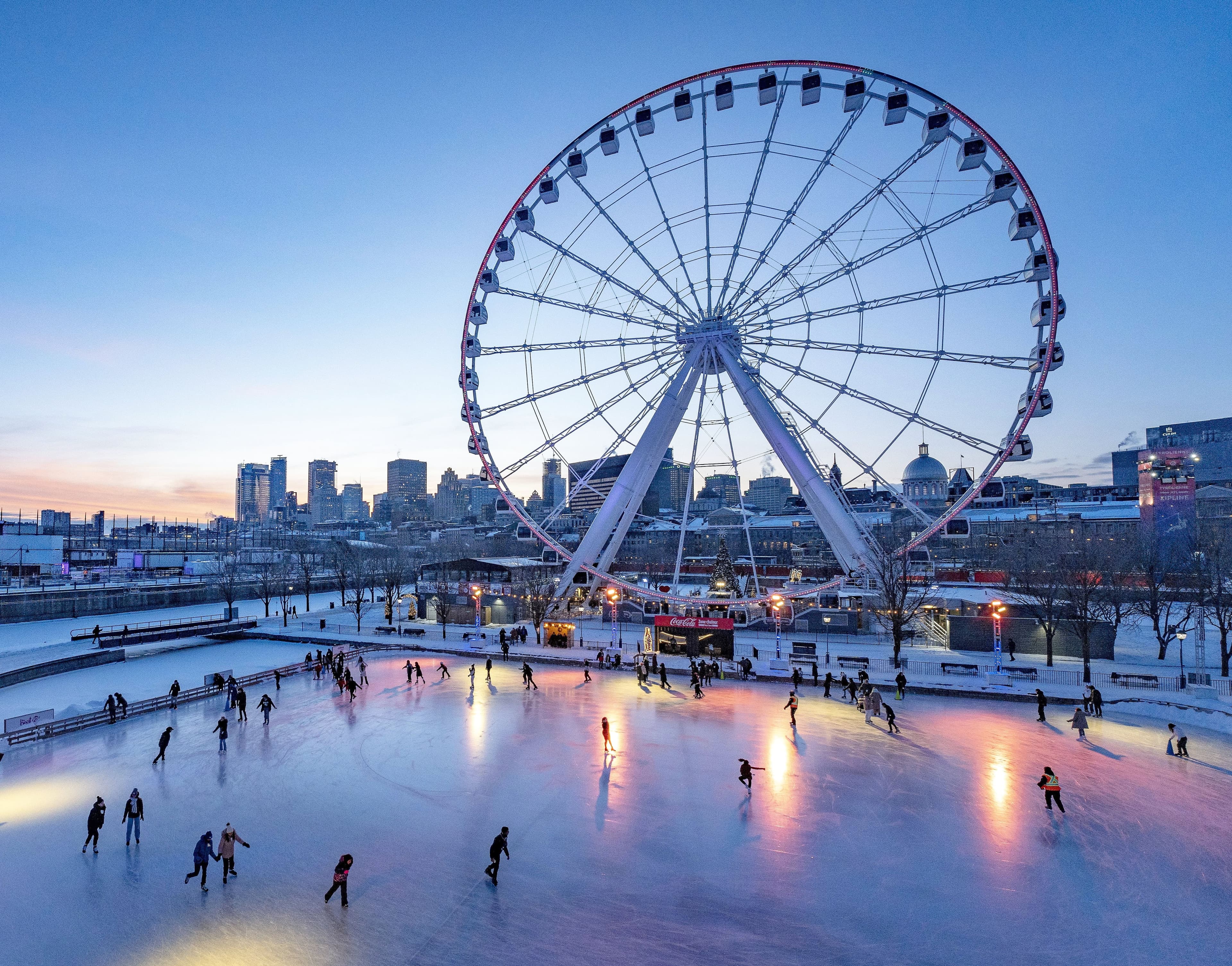 Ouverte le 14 décembre dernier, la patinoire au bassin Bonsecours s’étend au pied de la Grande Roue. Détail intéressant : la surface équivaut à une fois et demie celle du Centre Bell.