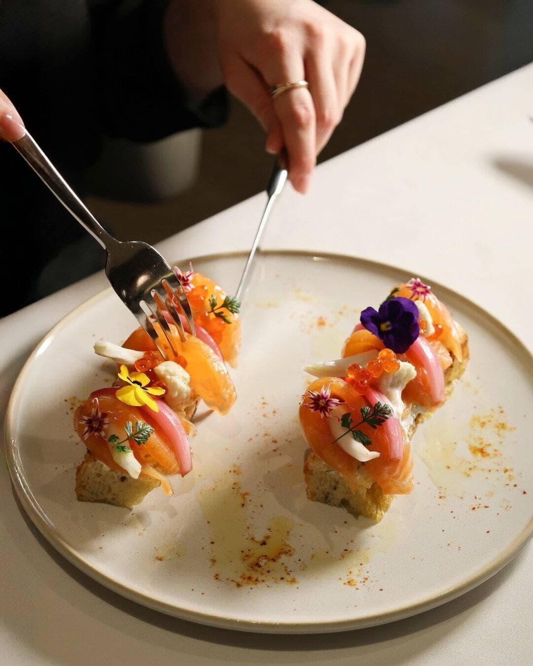 Le restaurant Nymark, situé dans l’impressionnant Fairmont le Château Montebello, rend à la fois hommage à Victor Nymark, maître d’œuvre finlandais ayant supervisé la construction du château en 1930 – aujourd’hui encore reconnu comme le plus grand bâtiment en bois rond du monde –, ainsi qu’aux traditions du peuple autochtone Ojibwé. Le chef Justin Charette revisite des recettes ancestrales en incluant des techniques modernes, ainsi qu’en privilégiant des ingrédients régionaux et de saison. Sa cuisine sera parfois ponctuée de parfums boisés, venant de l’épinette blanche (accompagnant une longe de cerf avec une sauce à l’érable), parfois de la mer, venant des algues ou de la salicorne (avec un omble chevalier fumé ou un filet de sébaste), et très souvent agrémentée d’ingrédients de la cueillette: cèdre, bouton de marguerite, champignons, petits fruits). Quant au pain bannock, il trouvera naturellement sa place sur chaque table.