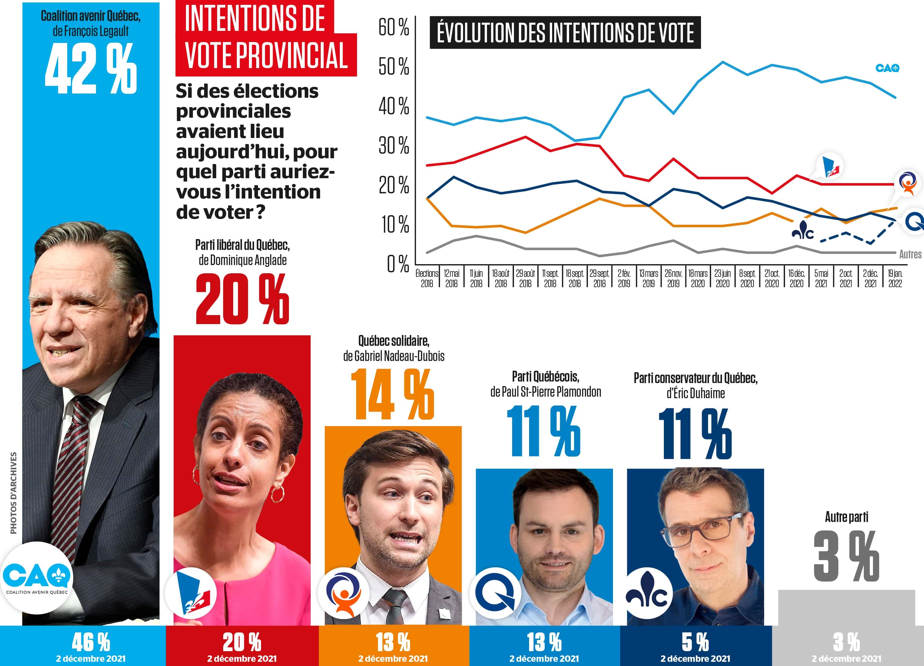 À un moment où le Québec enregistre un nombre record d’hospitalisations, la Coalition avenir Québec (CAQ) de François Legault subit un recul de quatre points par rapport au précédent sondage Léger publié le mois dernier.