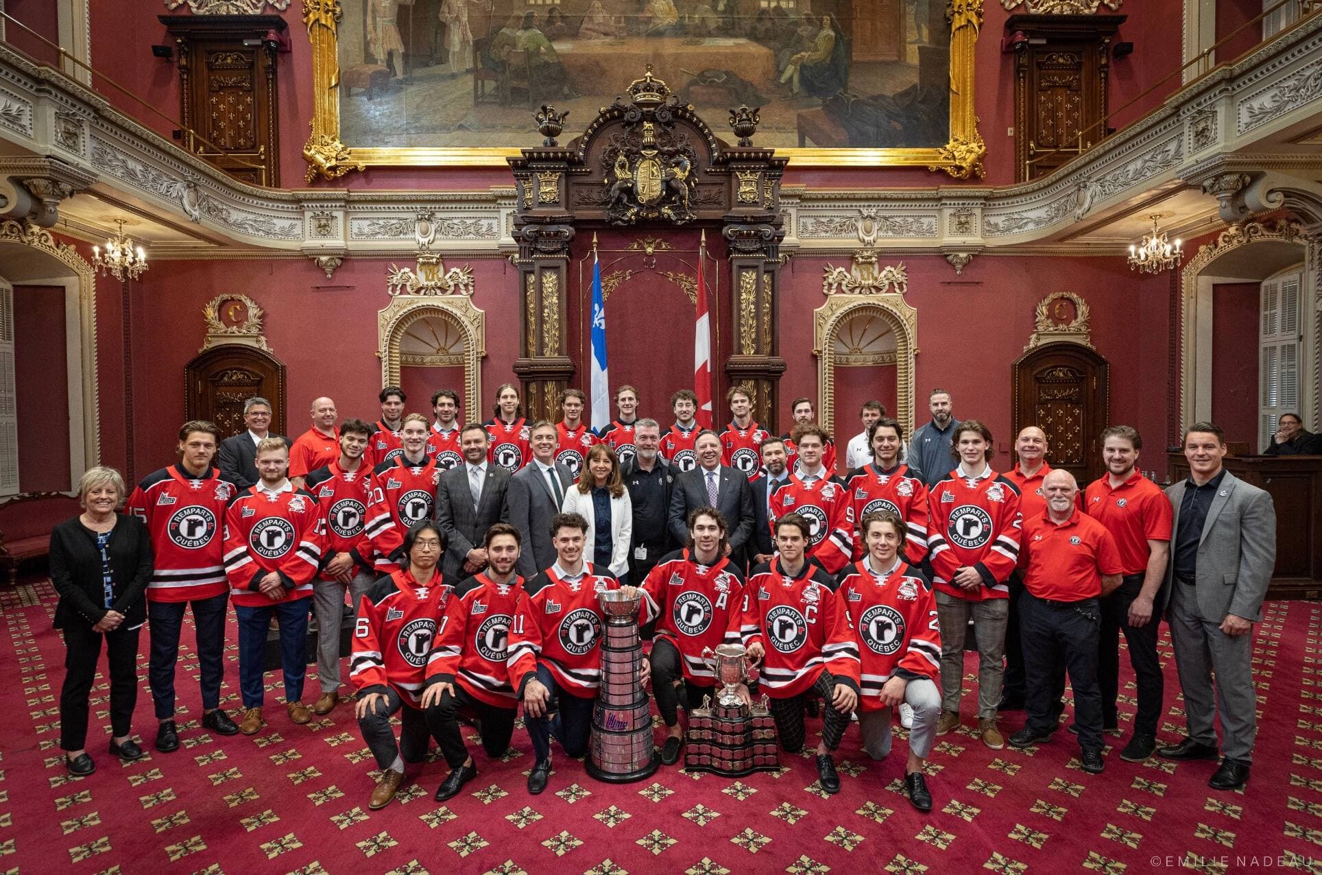Joueurs, entraîneurs et dirigeants se sont donc présentés sur les lieux avec leurs chandails rouges, mais surtout, la coupe symbolisant la suprématie au hockey junior canadien ainsi que le trophée Gilles-Courteau, qui récompense la formation championne de la Ligue de hockey junior majeur du Québec.