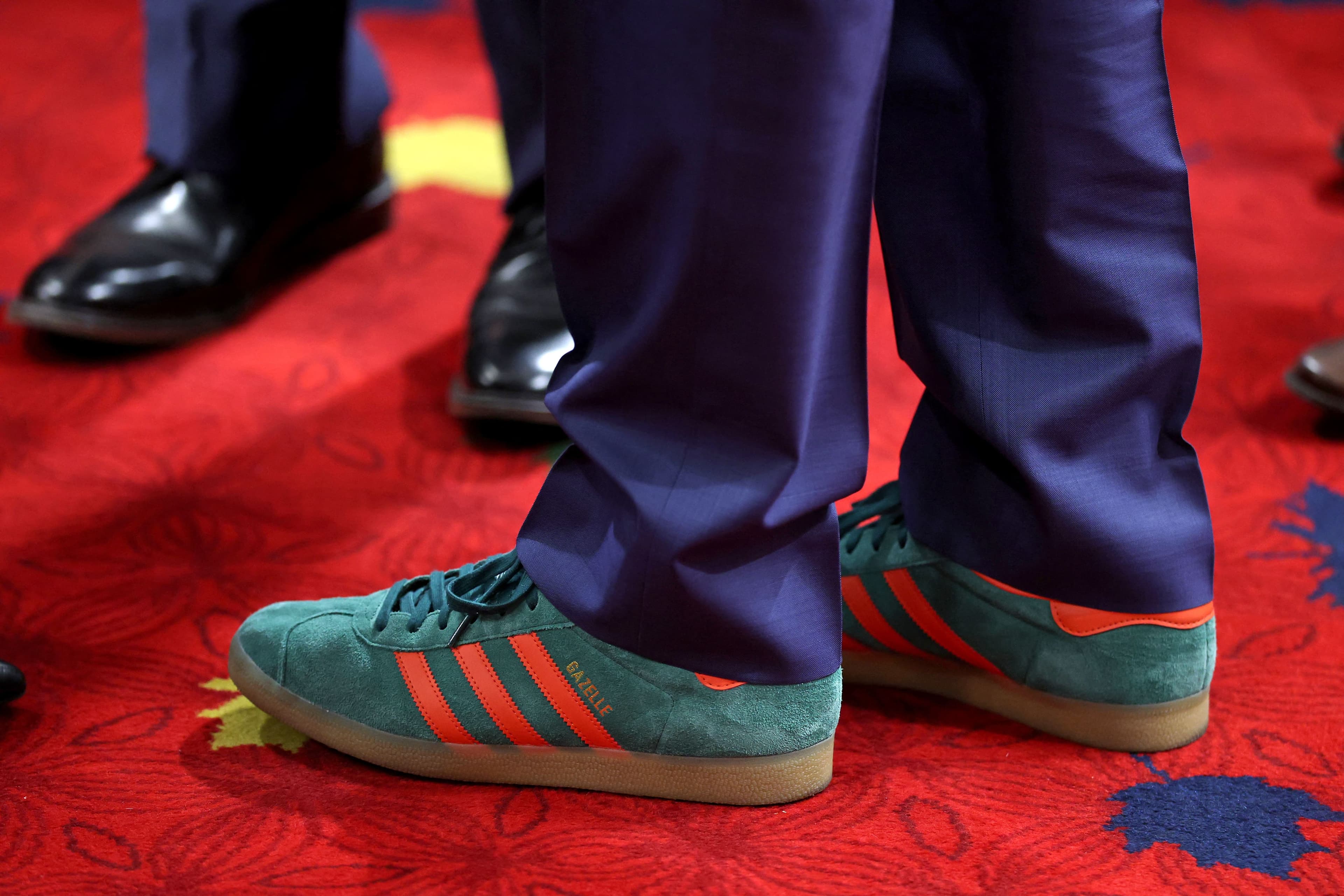 M. Trudeau est apparu dans la Chambre rouge du Sénat du Parlement du Canada chaussé d’Adidas Gazelle de couleur bleu vert avec les trois lignes, emblème de la marque, orange.