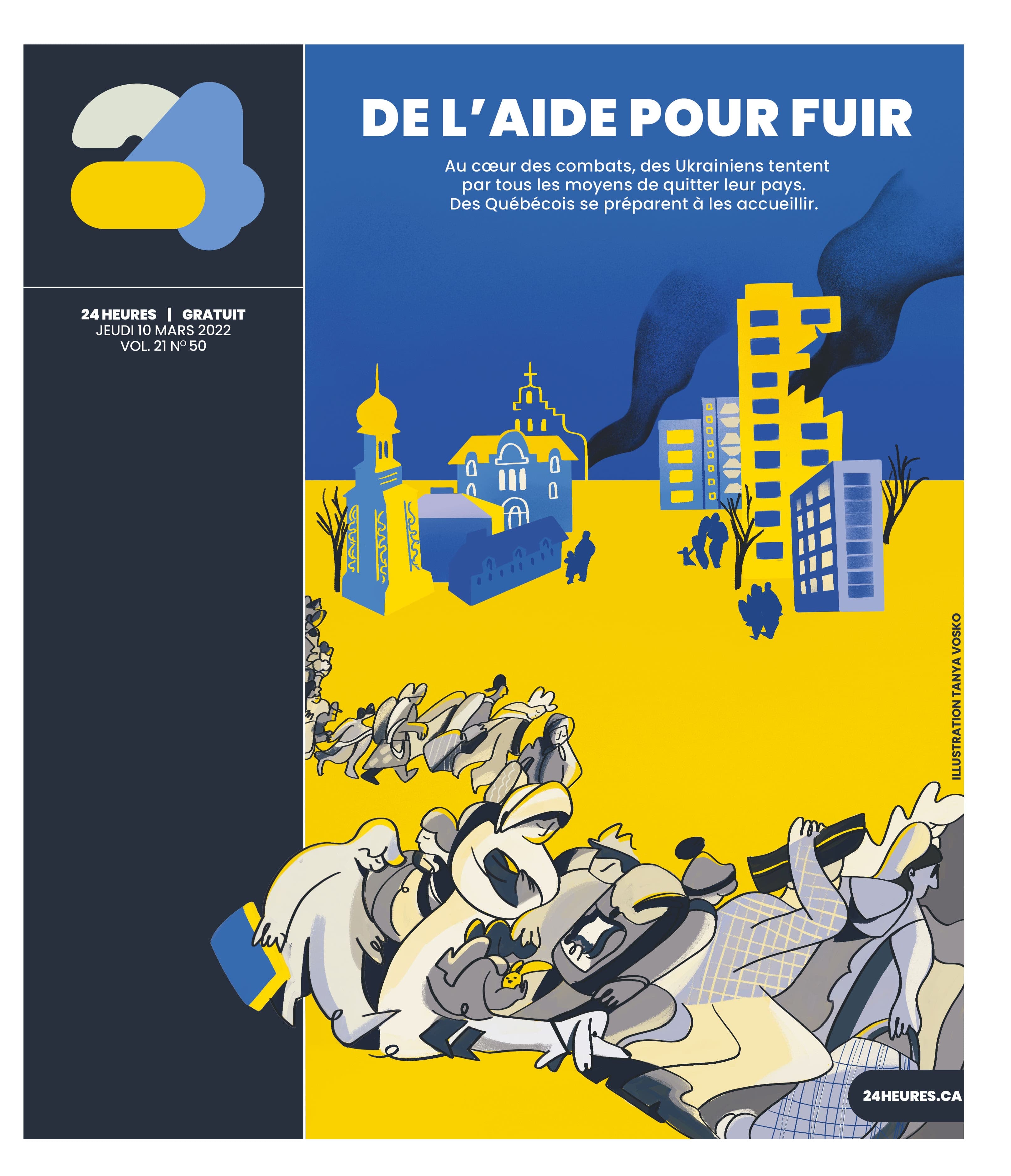 Quitter son pays et tout laisser derrière par obligation, parce que notre vie en dépend: c’est ce que l’illustratrice Tanya Voskoboikyk voulait traduire sur la une de notre plus récent numéro consacré aux histoires tragiques des réfugiés ukrainiens.