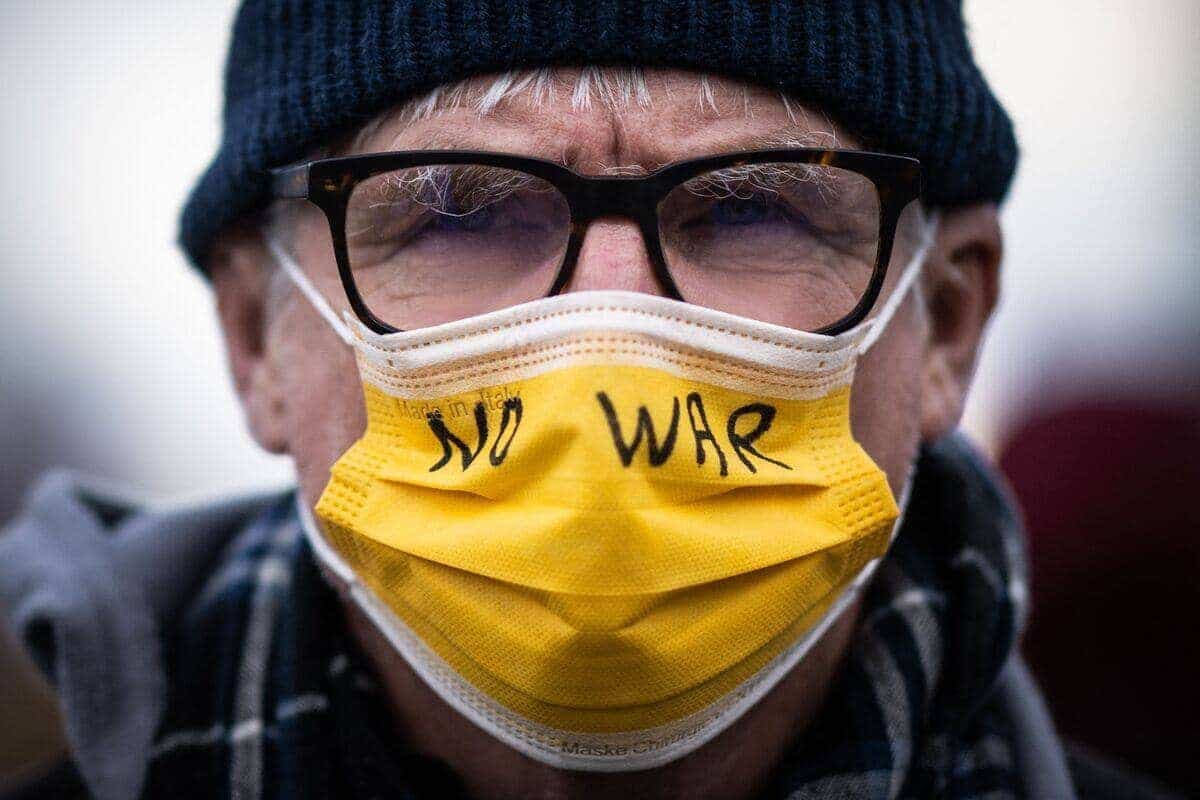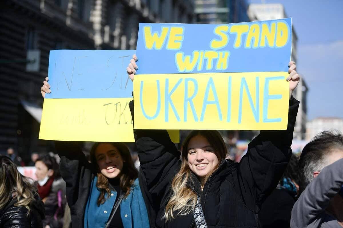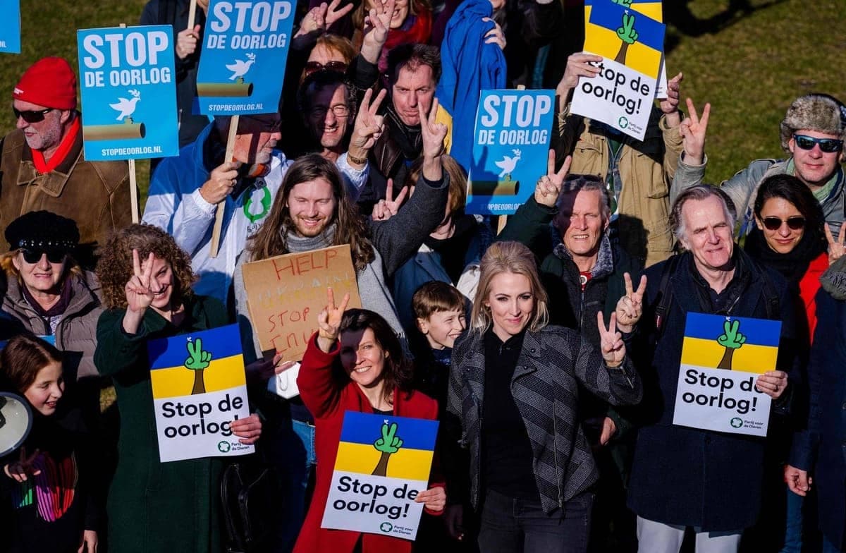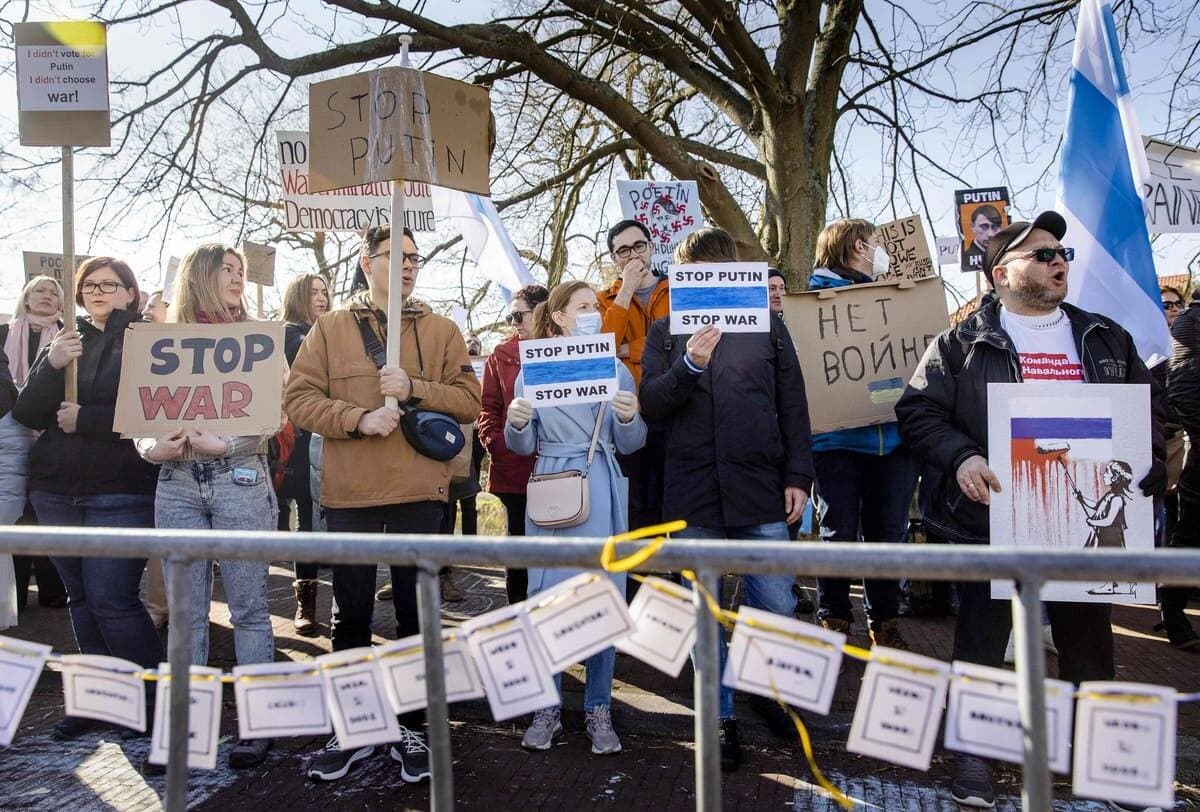 Les manifestants portaient des pancartes «Stop War» ou «Peace» et des drapeaux ukrainiens.