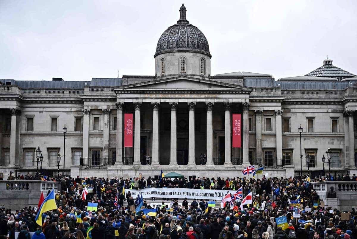 La foule s'est rassemblée à Trafalgar Square, dans le centre de la capitale britannique, brandissant des pancartes avec des inscriptions comme «Poutine tue» et «Embargo total contre la Russie» et criant «Arrêtez Poutine, arrêtez la guerre !».