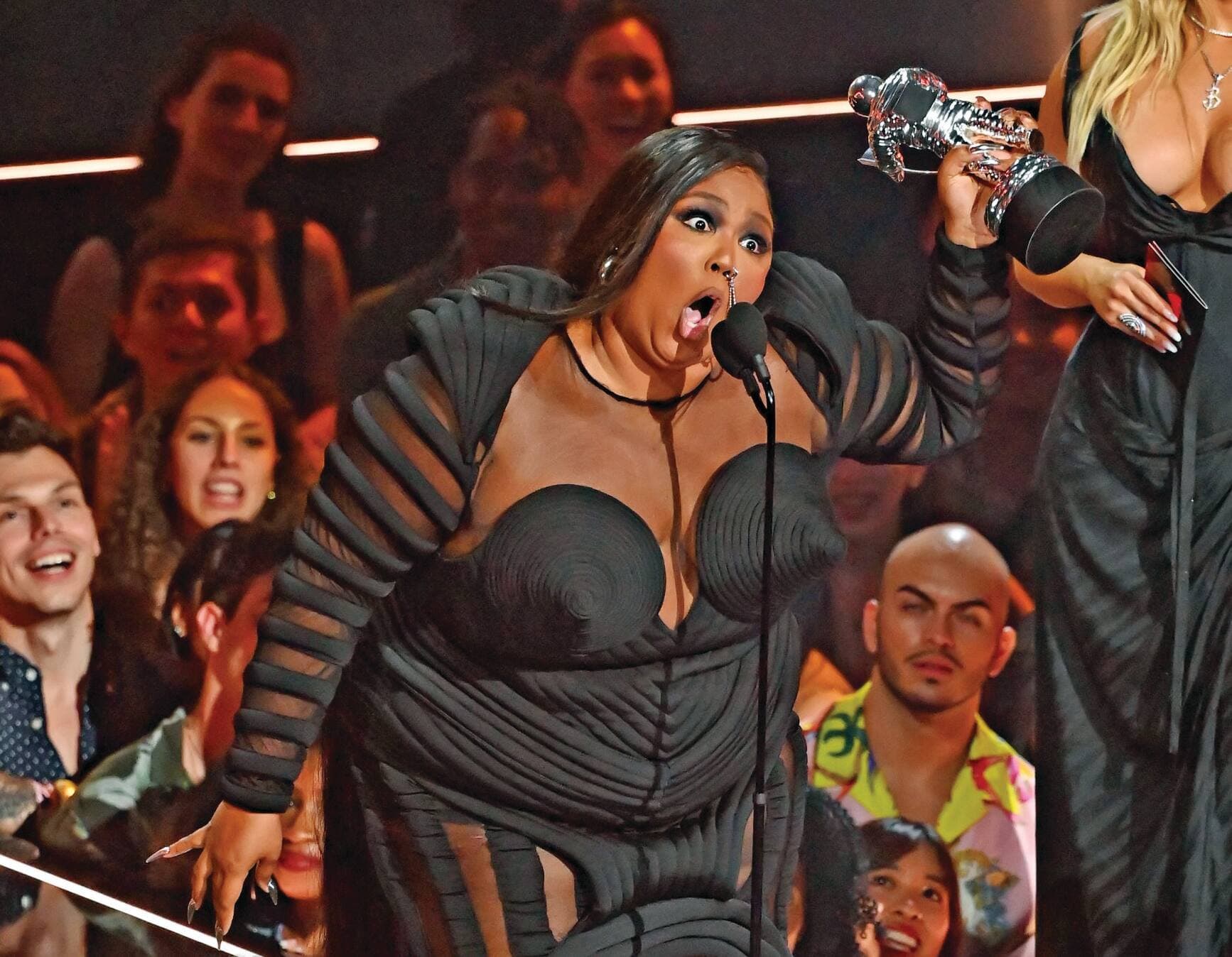 «Aux connards qui ont quelque chose à dire sur moi dans la presse: vous savez quoi? Je ne dirai rien, parce que la big bitch gagne!» a-t-elle hurlé lors de son discours. Pour rappel, Aries Spears avait déclaré quelques jours plus tôt, au sujet de Lizzo: «Je trouve qu’elle ressemble à l’émoji qui représente une crotte. Elle a un très joli visage, mais elle n’arrête pas de montrer son corps. Qu’elle arrête de faire ça!» Cela n’a pas empêché Lizzo d’éclipser tout le monde sur le tapis rouge des MTV VMAs dans une robe bleu nuit signée Jean Paul Gaultier.