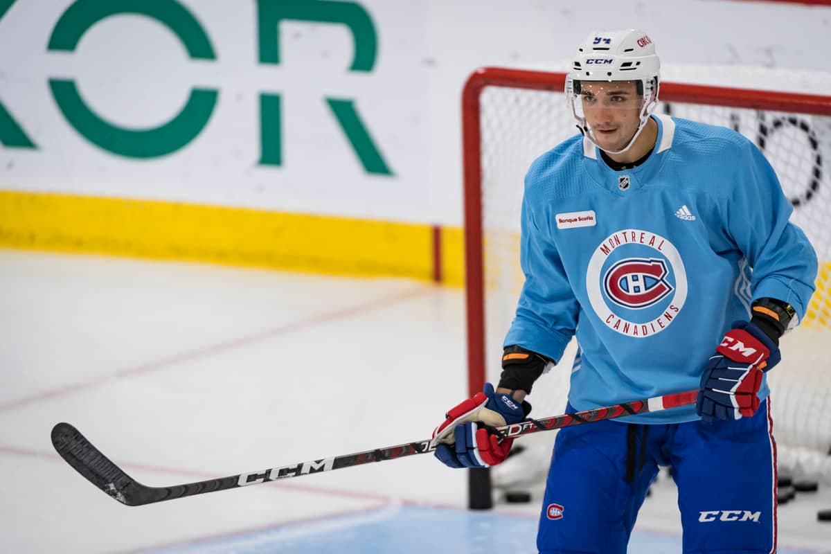Le jeune défenseur du Canadien de Montréal Logan Mailloux s’est entraîné avec les autres espoirs de l’organisation mardi, mais avec un chandail interdisant les contacts.