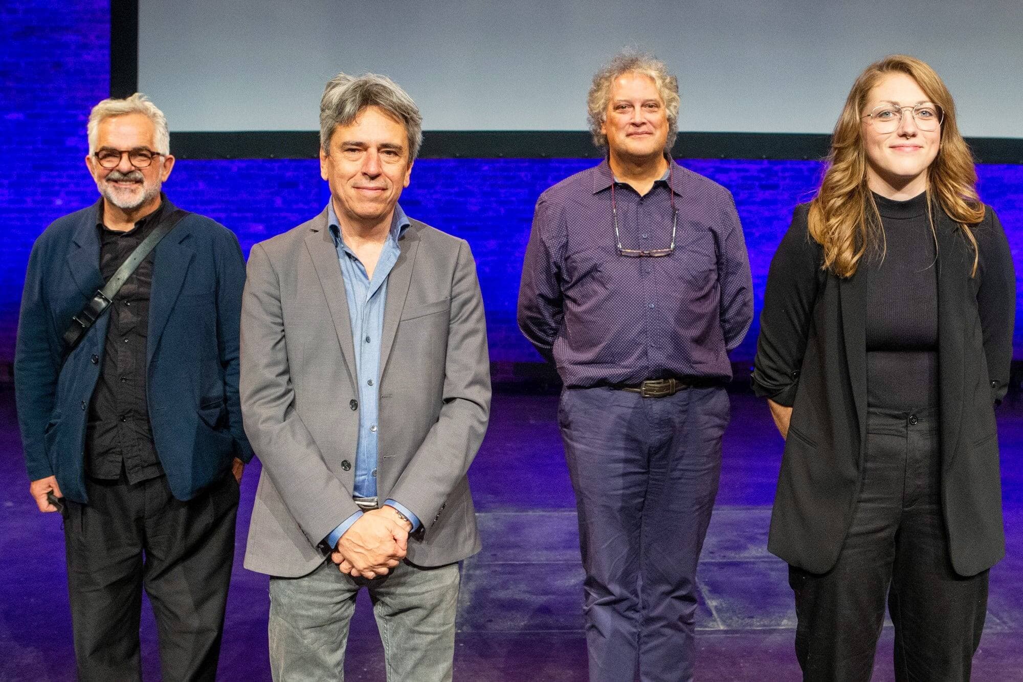 Louise Lecavalier, interprète et chorégraphe, et Marie-Ève Groulx, metteuse en scène de Awards du collectif Tôle sont entourées de Philippe Boutin, créateur et metteur en scène de The Rise of the BlingBling – La Genèse et de Maxime Brillon, auteur de Awards (collectif Tôle).