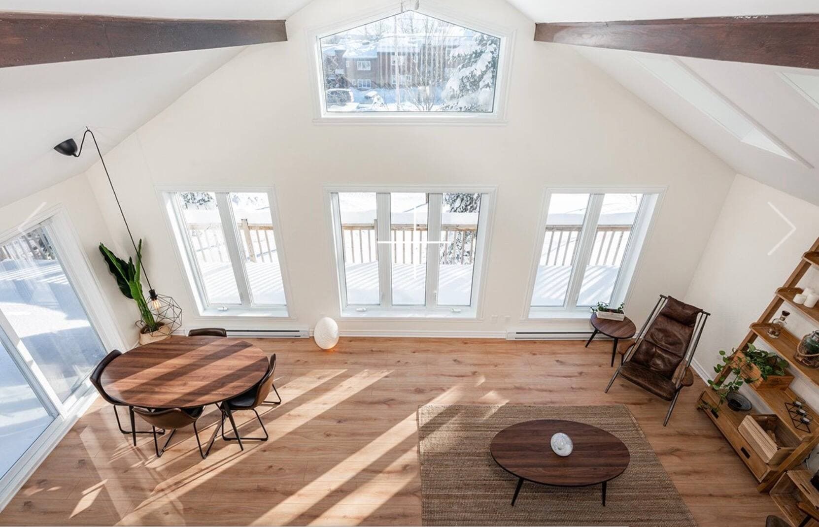 Entièrement rénovée en 2020, la propriété offre une aire de vie ultralumineuse au deuxième étage, avec plafond cathédrale, puits de lumière et fenestration généreuse.