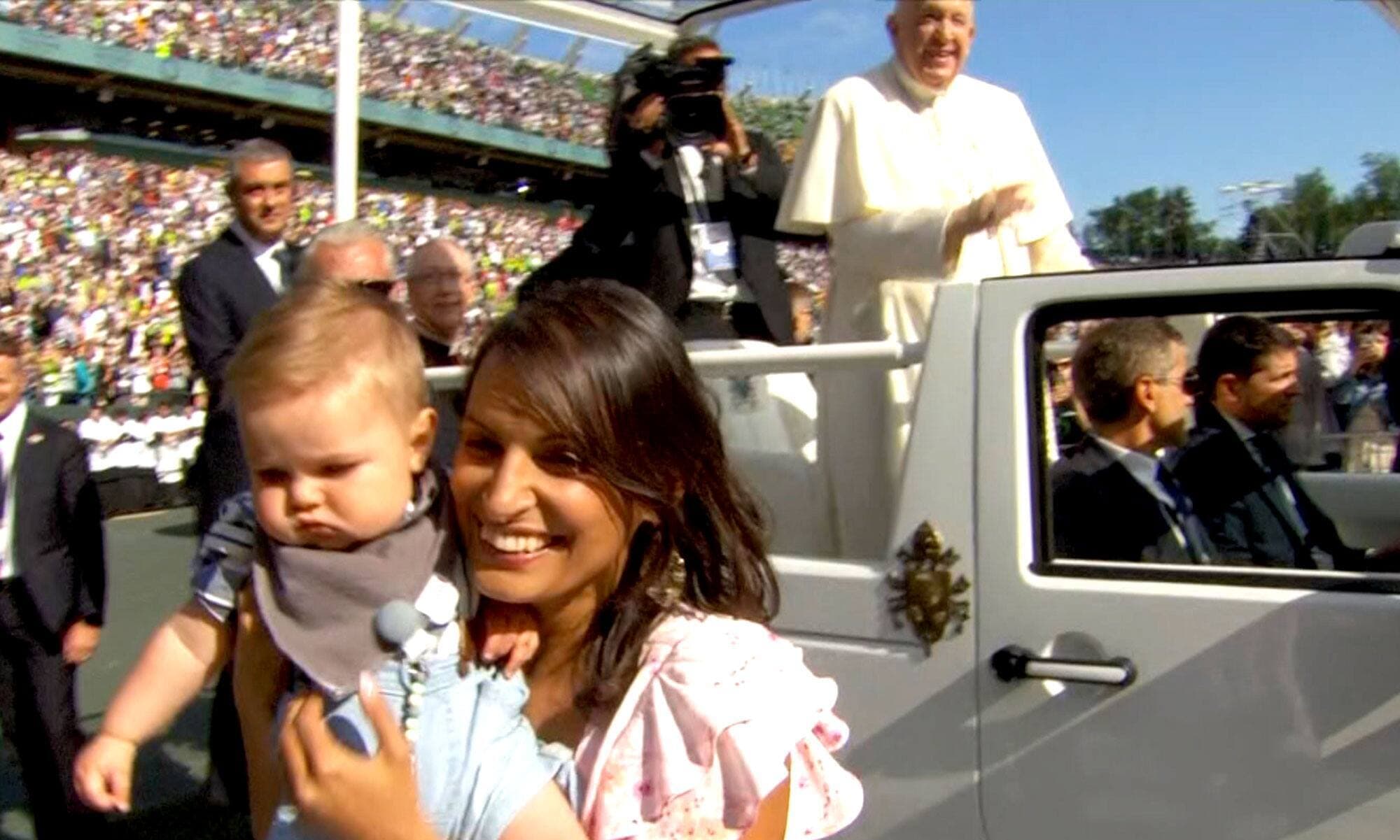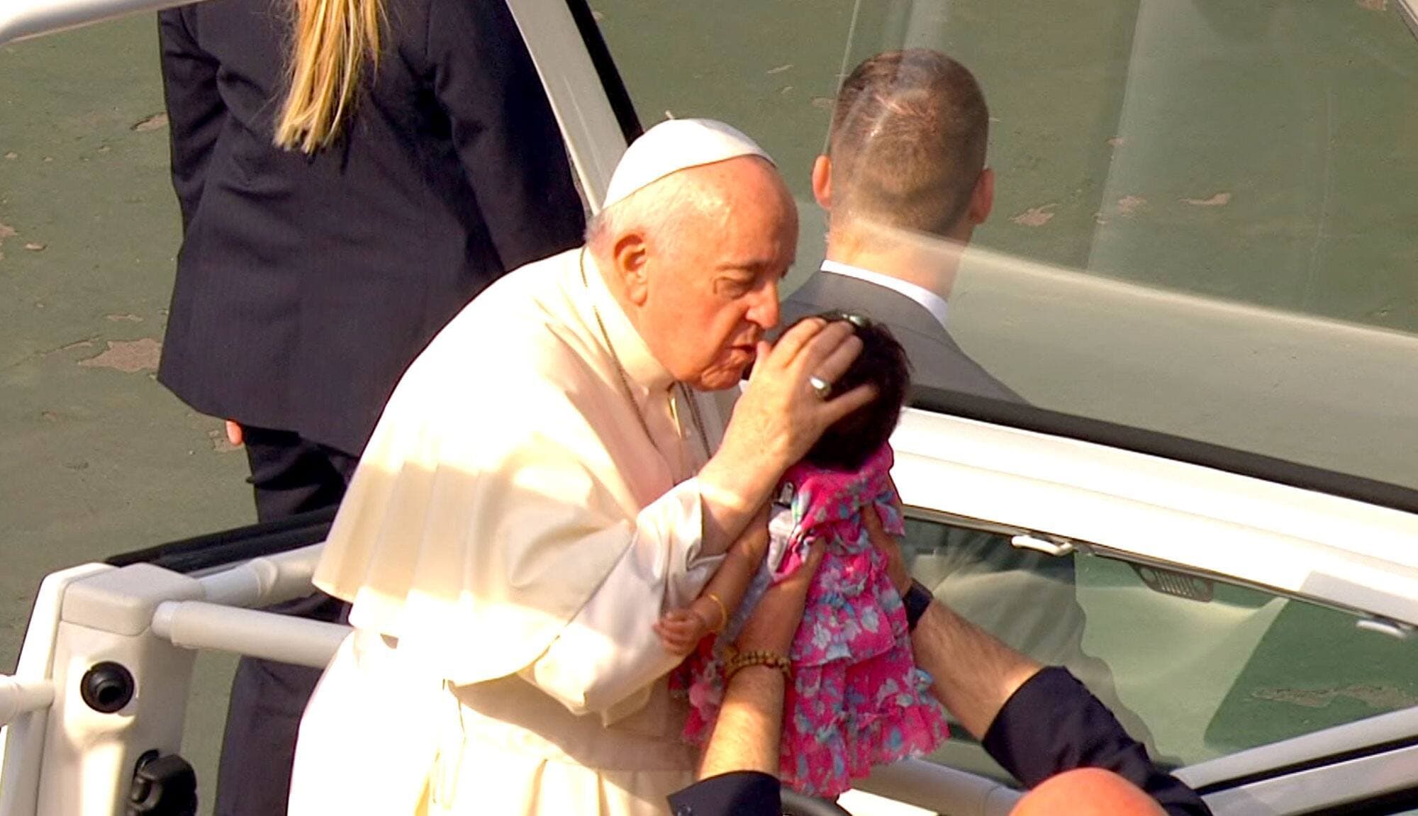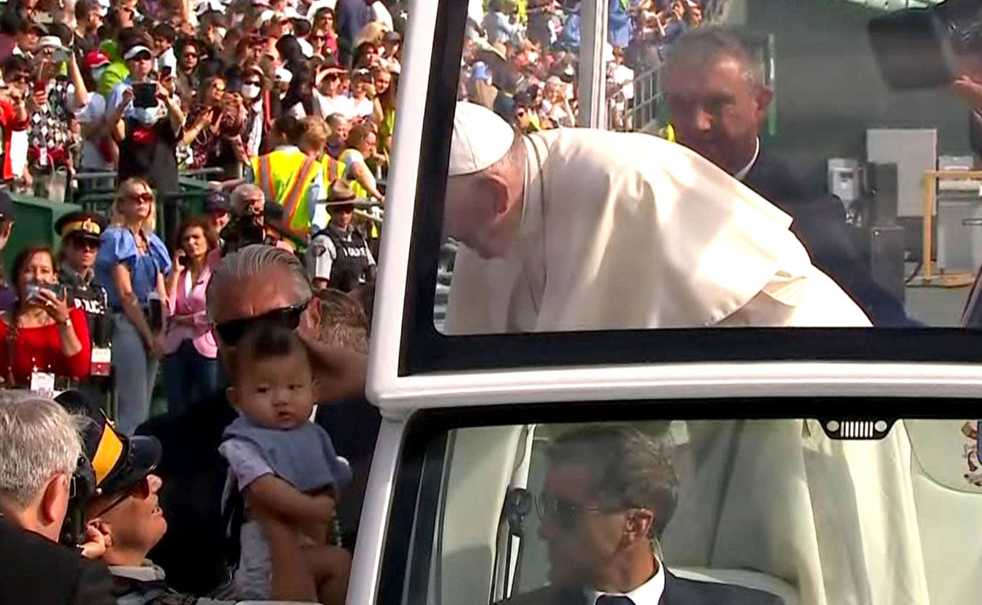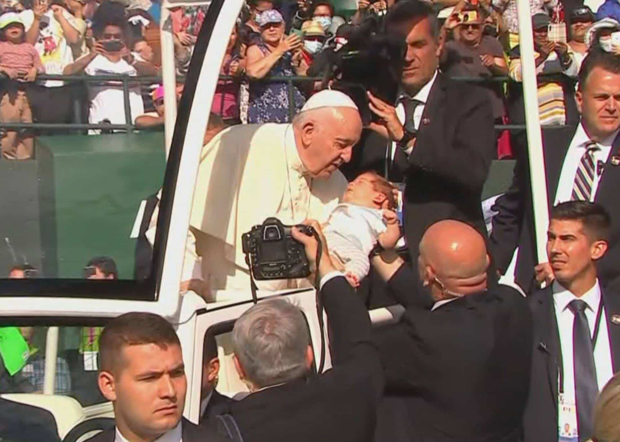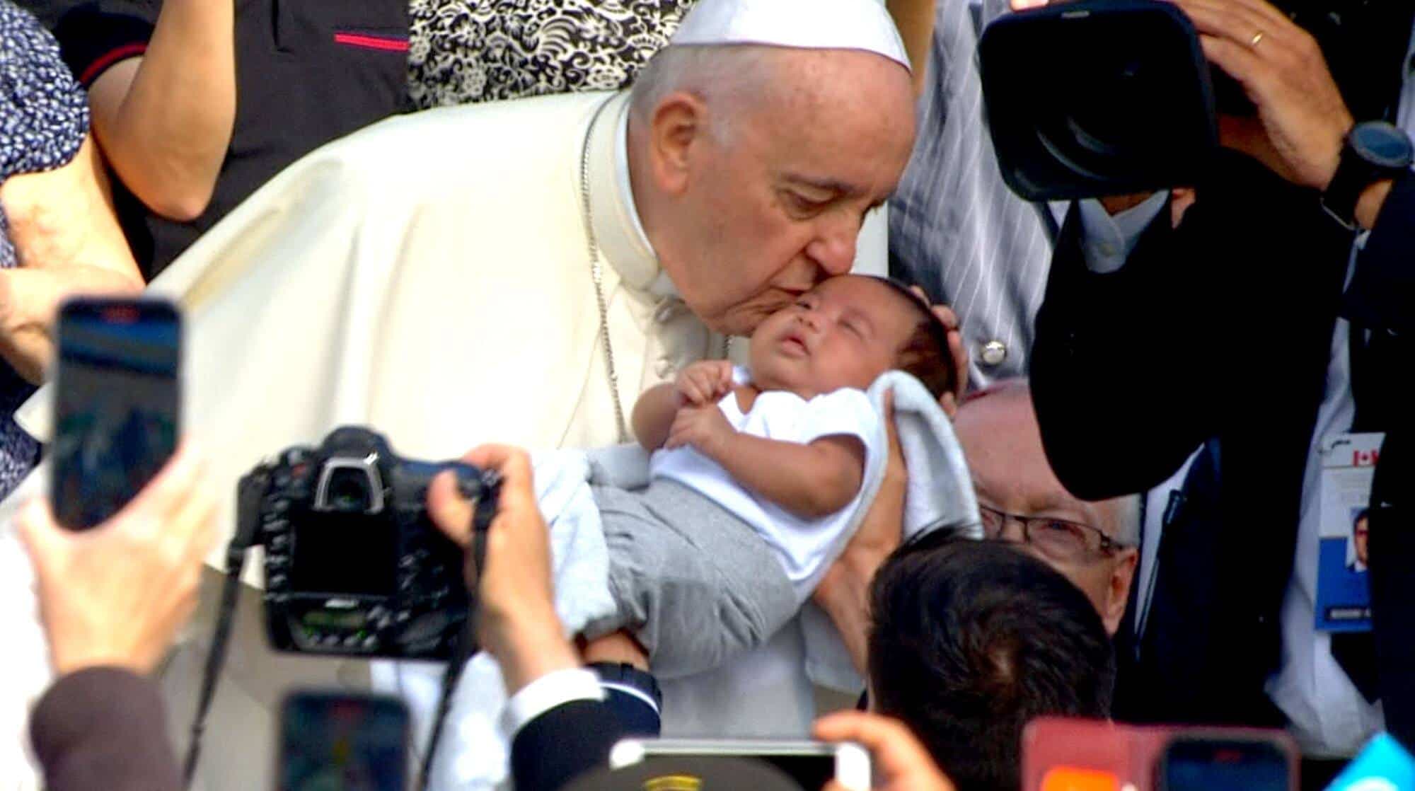 Fidèle à ses habitudes papales, le pape François a embrassé une multitude de bébés lors de son défilé au stade du Commonwealth, mardi à Edmonton.