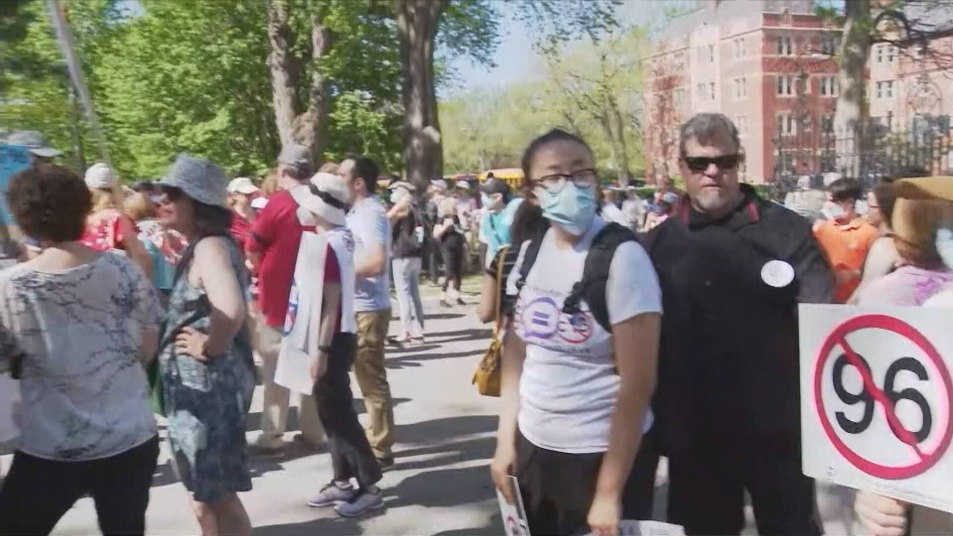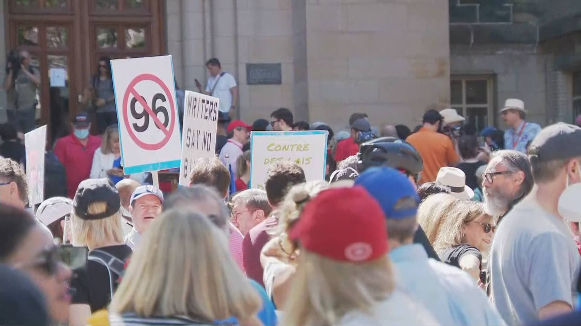 Des centaines de personnes se sont réunies devant le Collège Dawson à Montréal pour manifester contre le projet de loi 96 qui vise à réformer la Charte de la langue française.