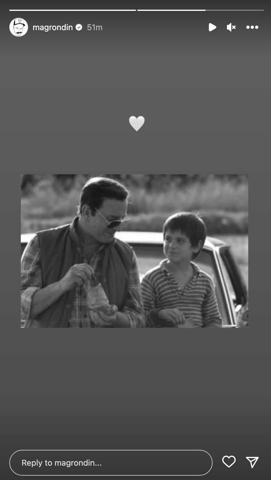 Dans sa story Instagram, l’acteur de 39 ans a partagé une photo en noir et blanc de Michel Côté avec le comédien Émile Vallée (qui jouait le rôle du jeune Marc-André dans C.R.A.Z.Y.) accompagné d’un coeur blanc.