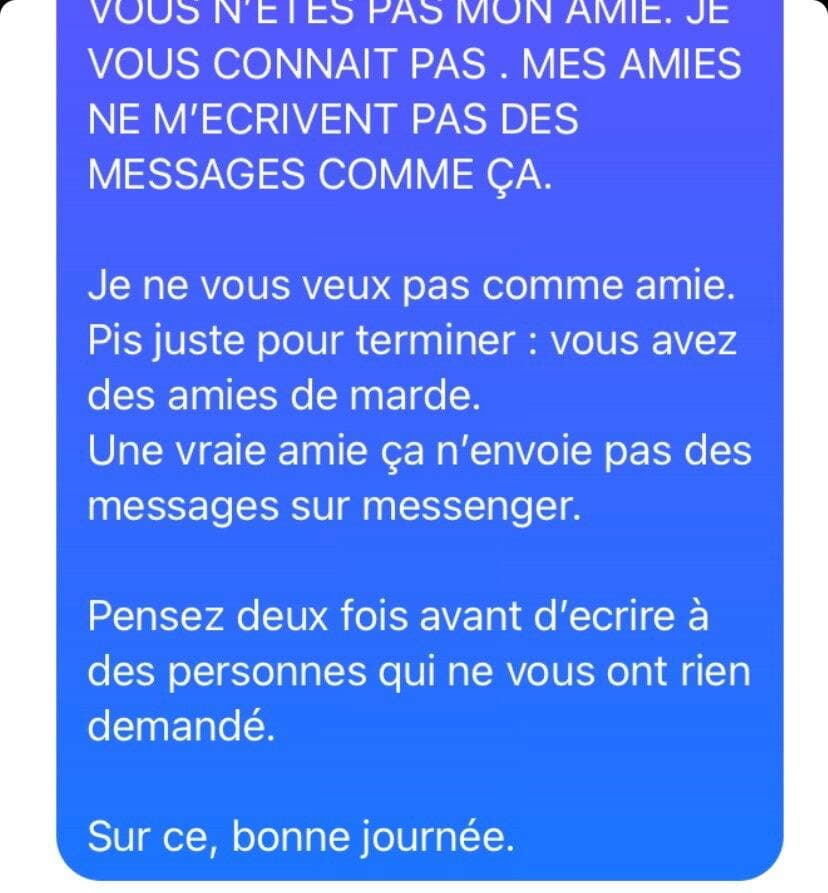 «Parlez-en entre vous, parlez-en dans vos soupers, mais c***cer moi patience avec vos os**e de suggestions pas bonnes», a-t-elle écrit.