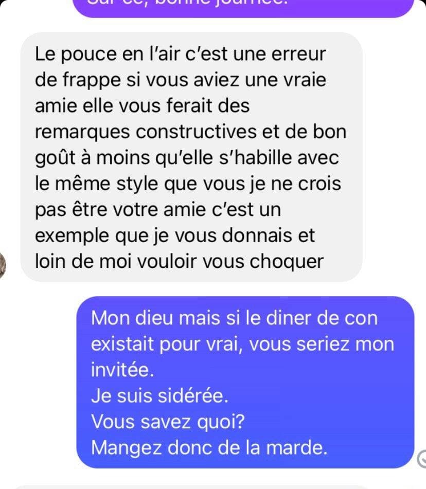 L'humoriste ne peut pas concevoir qu'on puisse envoyer un message à une personne qu'on ne connaît pas pour lui faire des suggestions sur son habillement. On la comprend un brin...