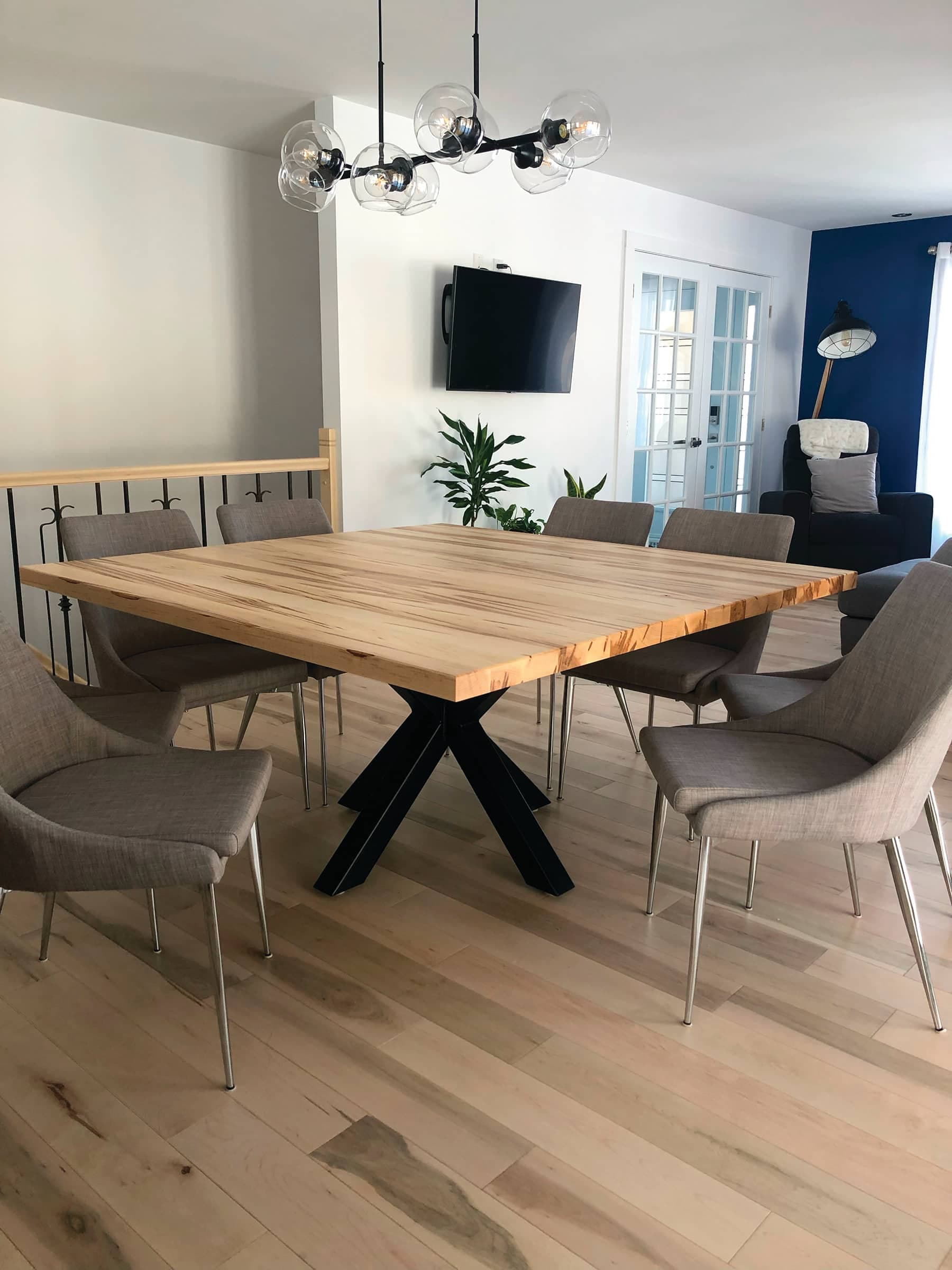 Le marché dans lequel Martin s’est lancé est parmi les plus compétitifs. «Je sais bien que je ne suis pas le seul à offrir des produits de qualité, mais je crois que ce qui nous distingue, c’est notre approche client. Les gens sont les bienvenus à notre atelier; ils viennent sur place pour choisir leur bois, leur modèle. Ils sont impliqués dans tout le processus.» Martin avait aussi la volonté d’offrir un produit 100 % local. Il a choisi de n’utiliser aucun bois exotique provenant de l’extérieur du pays afin de réduire son empreinte écologique. Le Québec dispose d’un magnifique éventail de bois, et c’est la même chose pour l’acier que Toi & Bois Qc. utilise pour les pattes de ses tables. «On travaille le merisier, l’érable, le noyer noir ainsi que le frêne. Comme il y a une belle quantité de frênes disponibles au Québec, les gens se sont rués vers cette essence.»