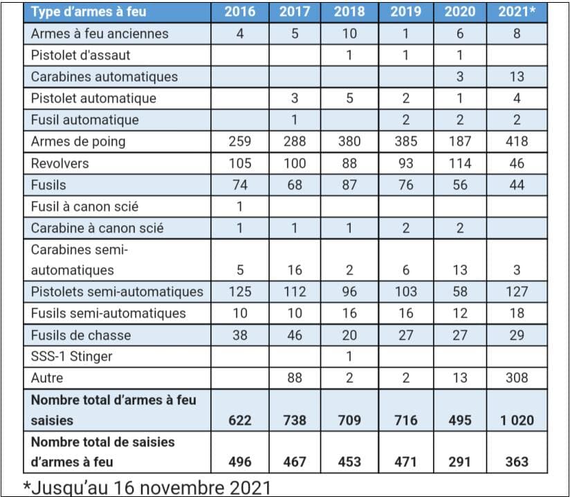 Les données uniquement pour le premier trimestre (avril-juin 2021) indiquent que les douaniers ont saisi au pays 509 armes à feu alors qu’ils en avaient saisi 548 pour l’année complète 2020-2021. En 2019-2020, ce chiffre s’élevait à 753.