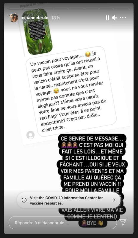 «Ce genre de message... C'est pas moi qui fais les lois... Et même si c'est illogique et fâchant... Oui, si je veux voir mes parents et ma famille au Québec, ça me prend un vaccin!! Pour moi, la famille c'est ce qu'il y a de plus important: sur ce, je vais aller vivre ma vie comme je l'entends. Bye.»
