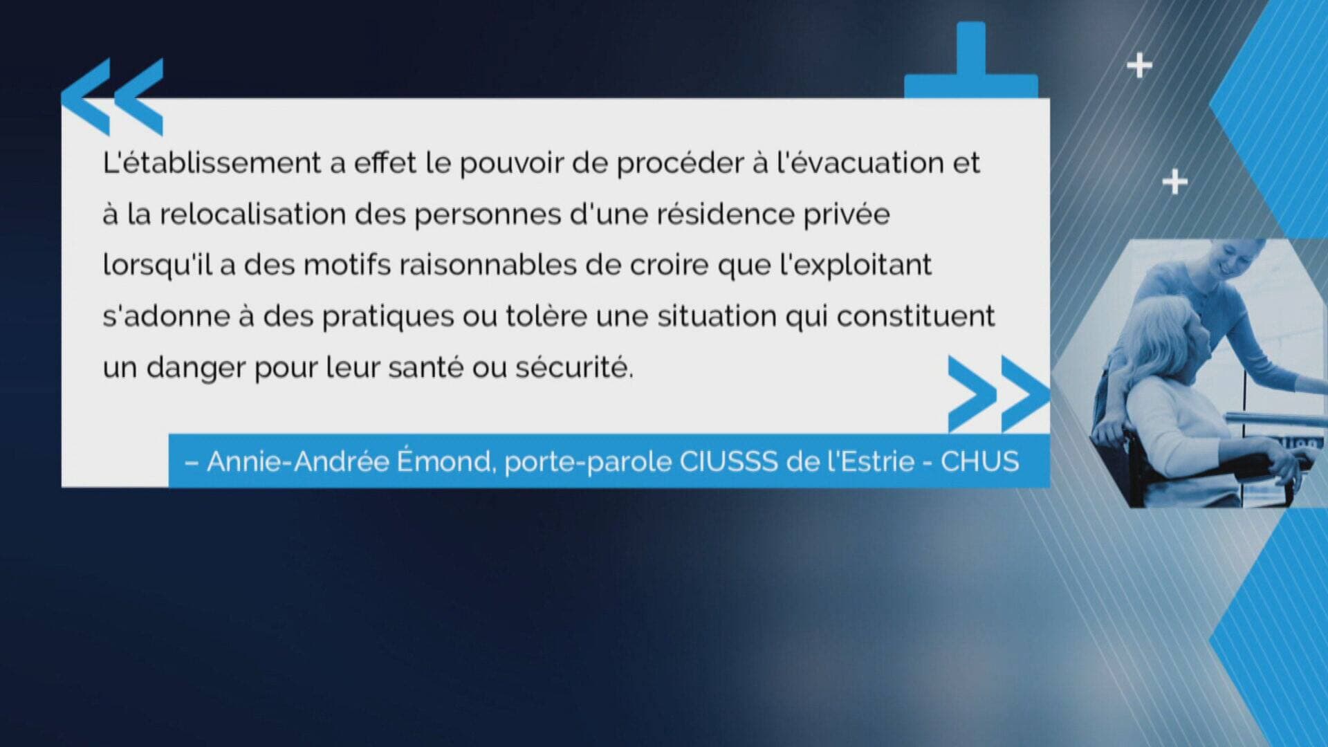 La résidence abritait une douzaine de suites et de chambres adaptées pour les personnes en perte d'autonomie. Une employée, encore sous le choc, a indiqué ne pas comprendre cette décision, expliquant qu'à sa connaissance, les propriétaires prenaient bien soin de leurs résidents.