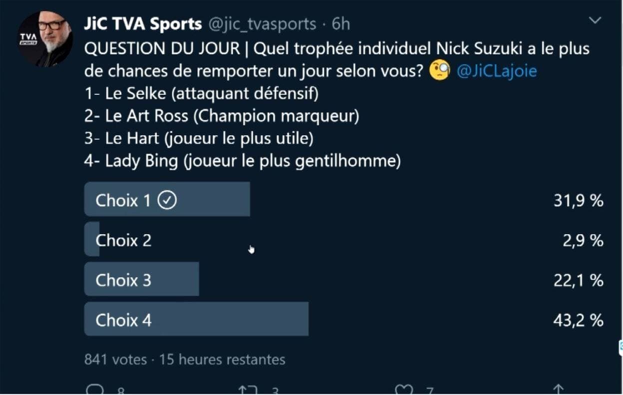Lors de son traditionnel «Édito», mardi, «JiC» s’est amusé à imaginer le trophée individuel que Nick Suzuki était le plus susceptible de remporter dans les prochaines années. Voyez le segment complet dans la vidéo ci-dessus.