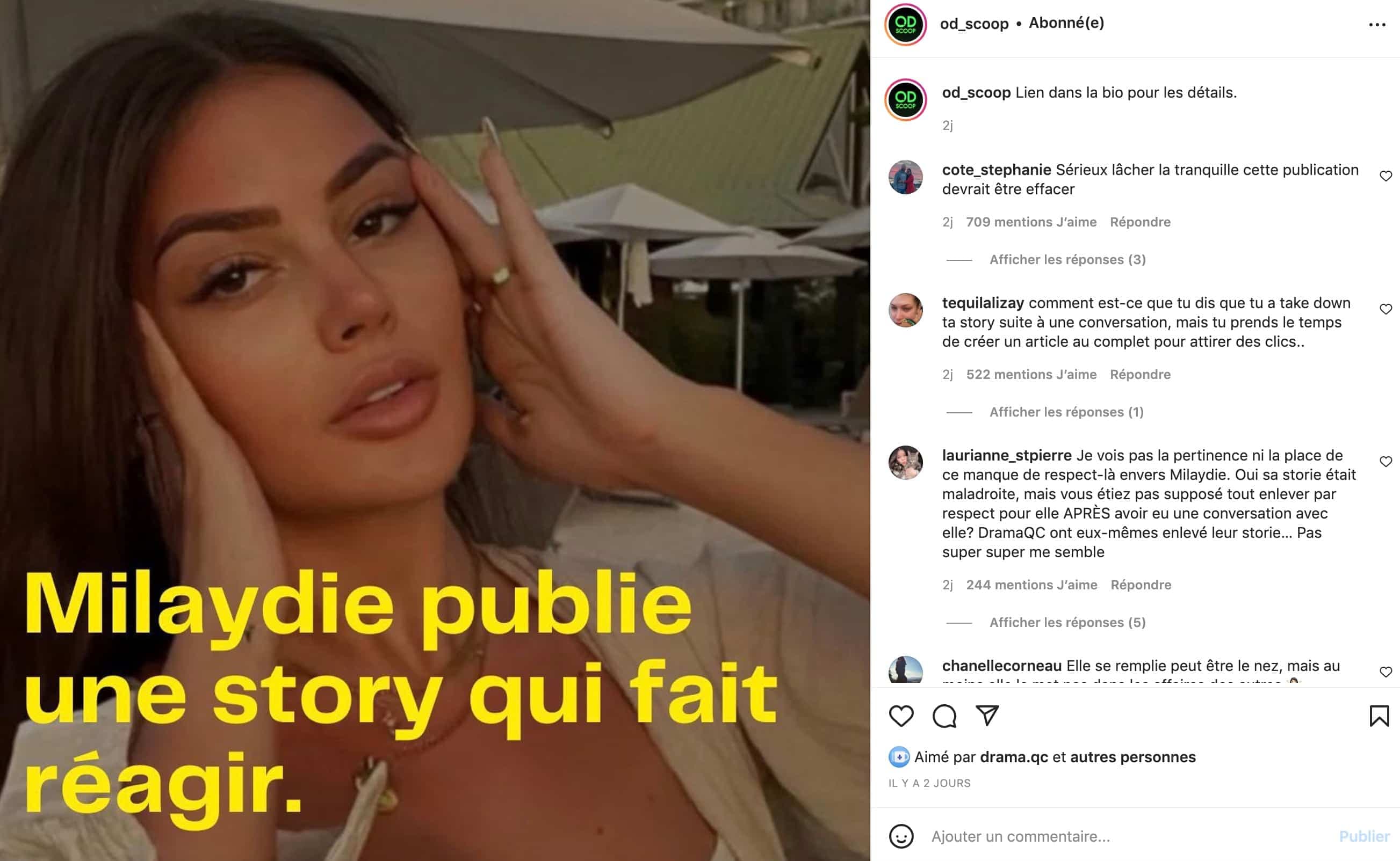 Le week-end dernier, le compte OD scoop a repartagé une story controversée qui avait été publiée, puis supprimée, par l’influenceuse Milaydie Bujold.