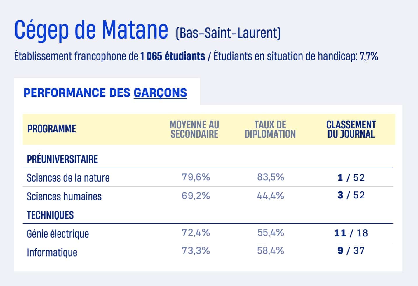 Le Cégep de Matane a réussi tout un exploit: il est l’un des établissements qui font le mieux réussir les garçons, à la fois en sciences humaines et en sciences de la nature, selon la toute nouvelle édition du Palmarès des cégeps du Journal.