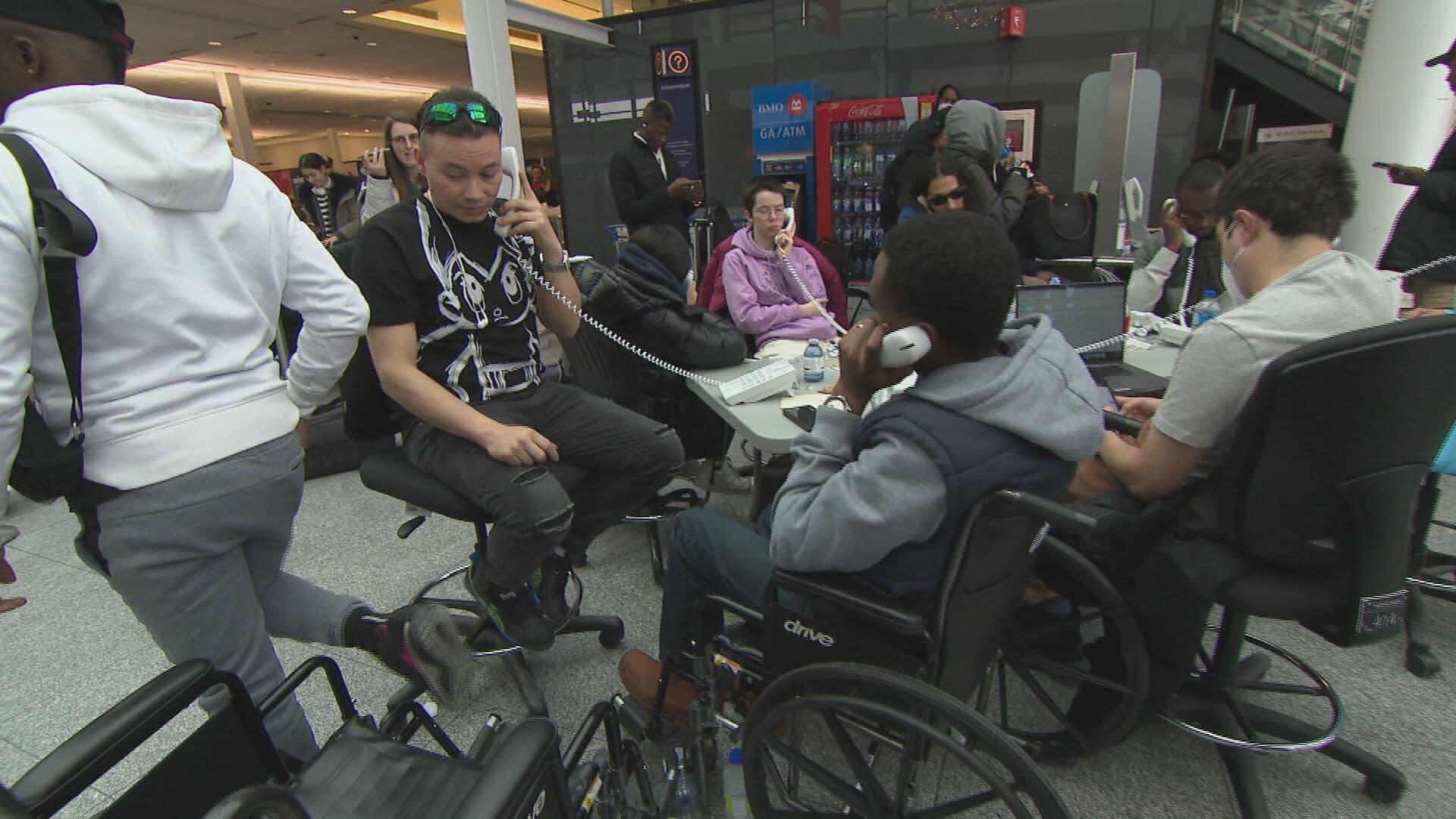 Parler à son transporteur aérien, n’est pas chose simple; des gens font la file depuis des heures, certains pendant plus de cinq heures, pour pouvoir utiliser le téléphone.