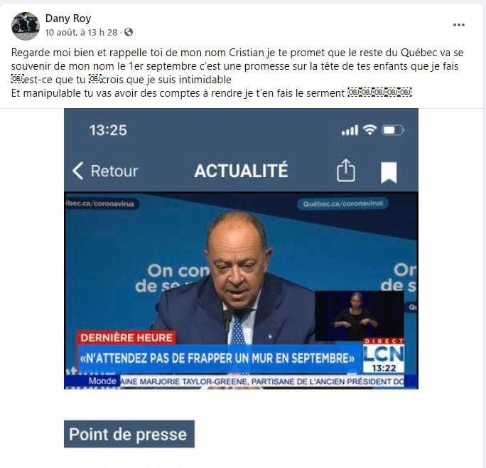 «Regarde-moi bien et rappelle-toi de mon nom Cristian (sic). Je te promet (sic) que le reste du Québec va se souvenir de mon nom le 1er septembre. C’est une promesse sur la tête de tes enfants que je fais. Est-ce que tu crois que je suis intimidable et manipulable? Tu vas avoir des comptes à rendre, je t’en fais le serment», peut-on lire sur la publication de la page Facebook de l’homme âgé de 40 ans.
