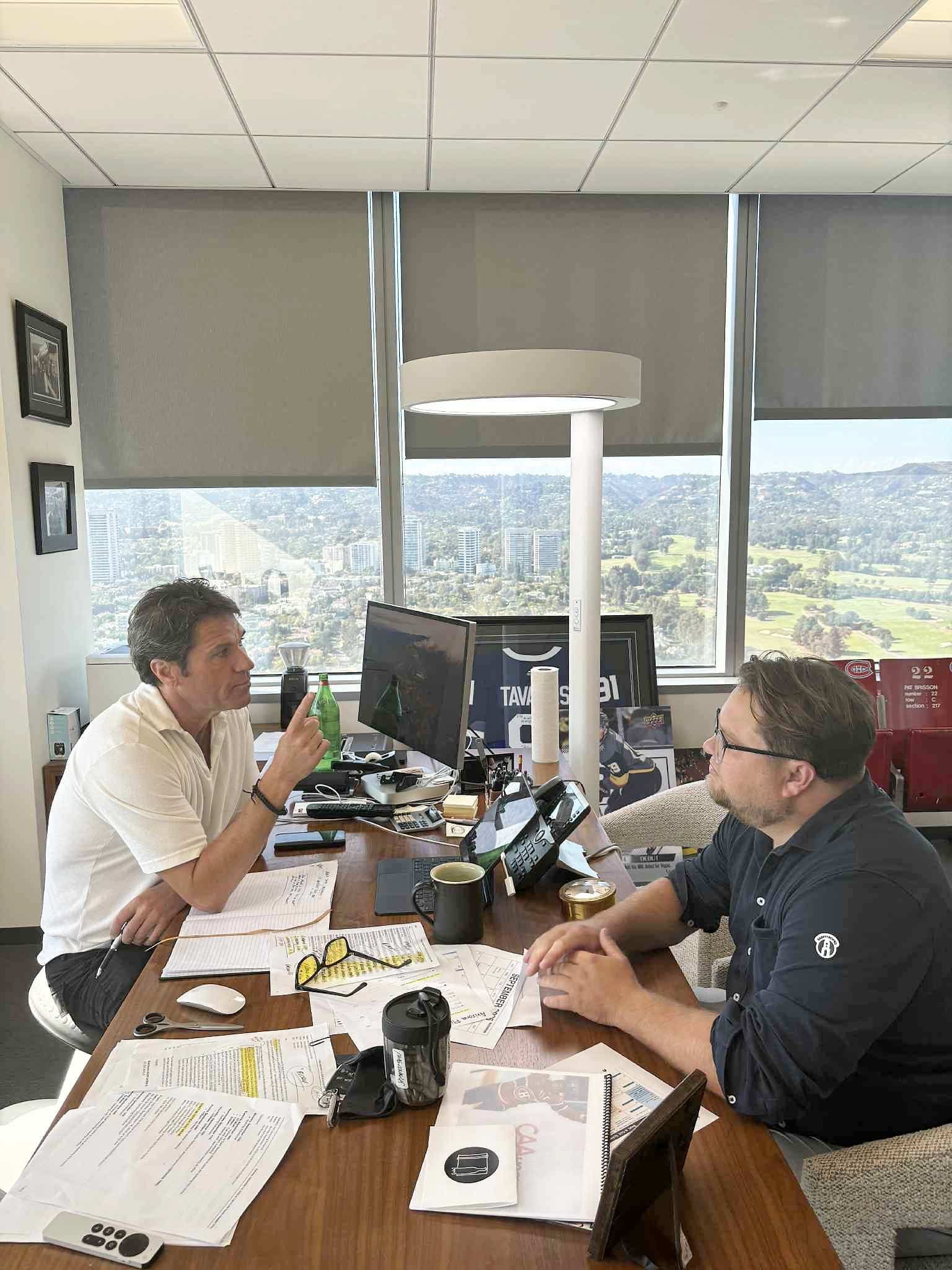 Du bureau dans les hauteurs de Pat Brisson, on voit le campus de l’établissement UCLA, l’océan Pacifique, Santa Monica, Venice Beach et, au pied, c’est le club de golf qui a accueilli l’US Open en 2023. En plus, c’est un de ses deux bureaux. Et ils vont déménager pour du mieux. Et Pat Brisson, lui, à 60 ans, a l’air de 45 avec sa gueule carrée d’acteur et sa coiffure de surfeur californien.