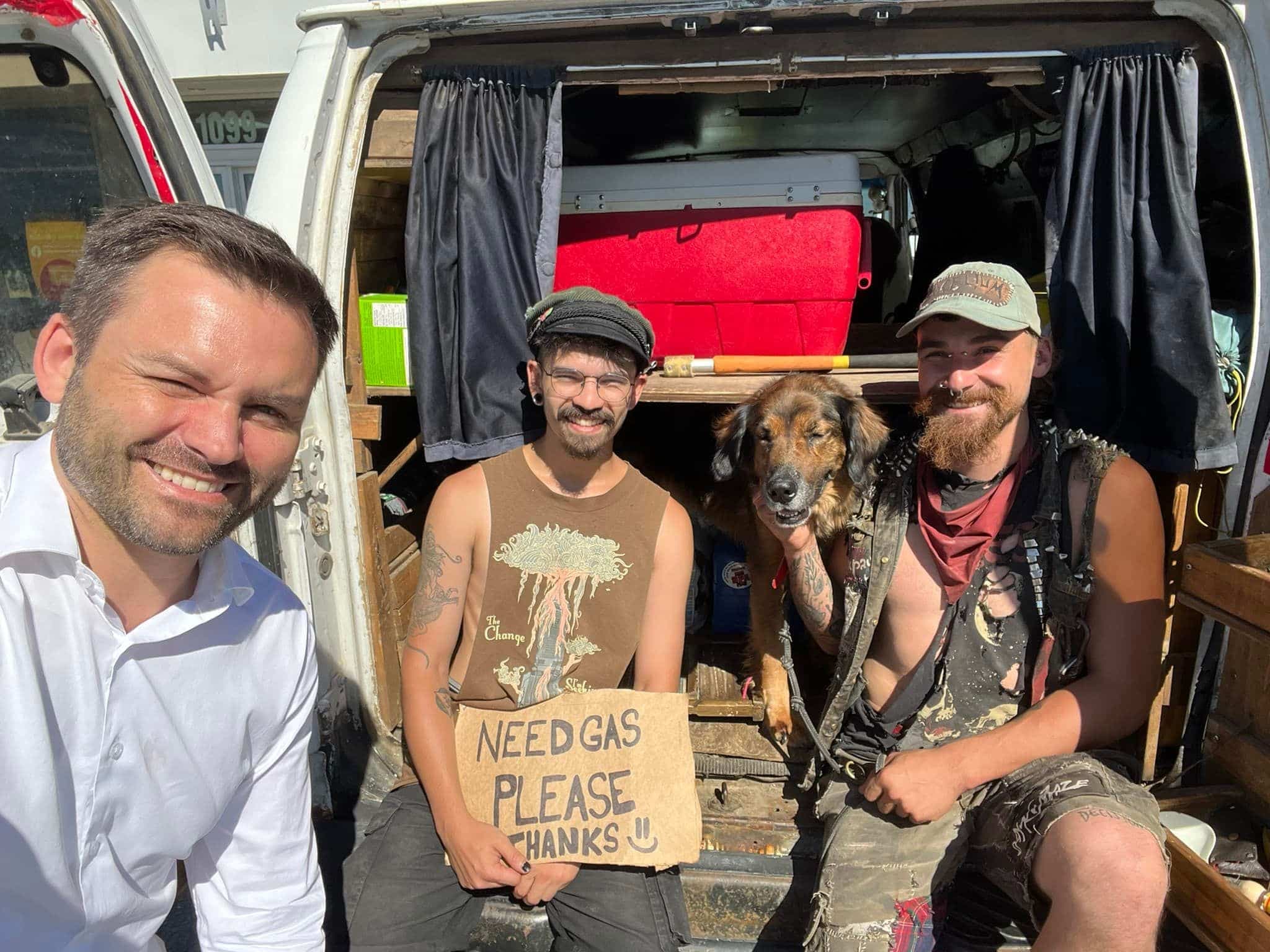 Les deux hommes avaient une pancarte sur laquelle ils demandaient de l’essence pour leur véhicule. Pour ajouter à l’anecdote, il se trouve que les deux individus font partie du groupe de musique folk-punk Mycélium.
