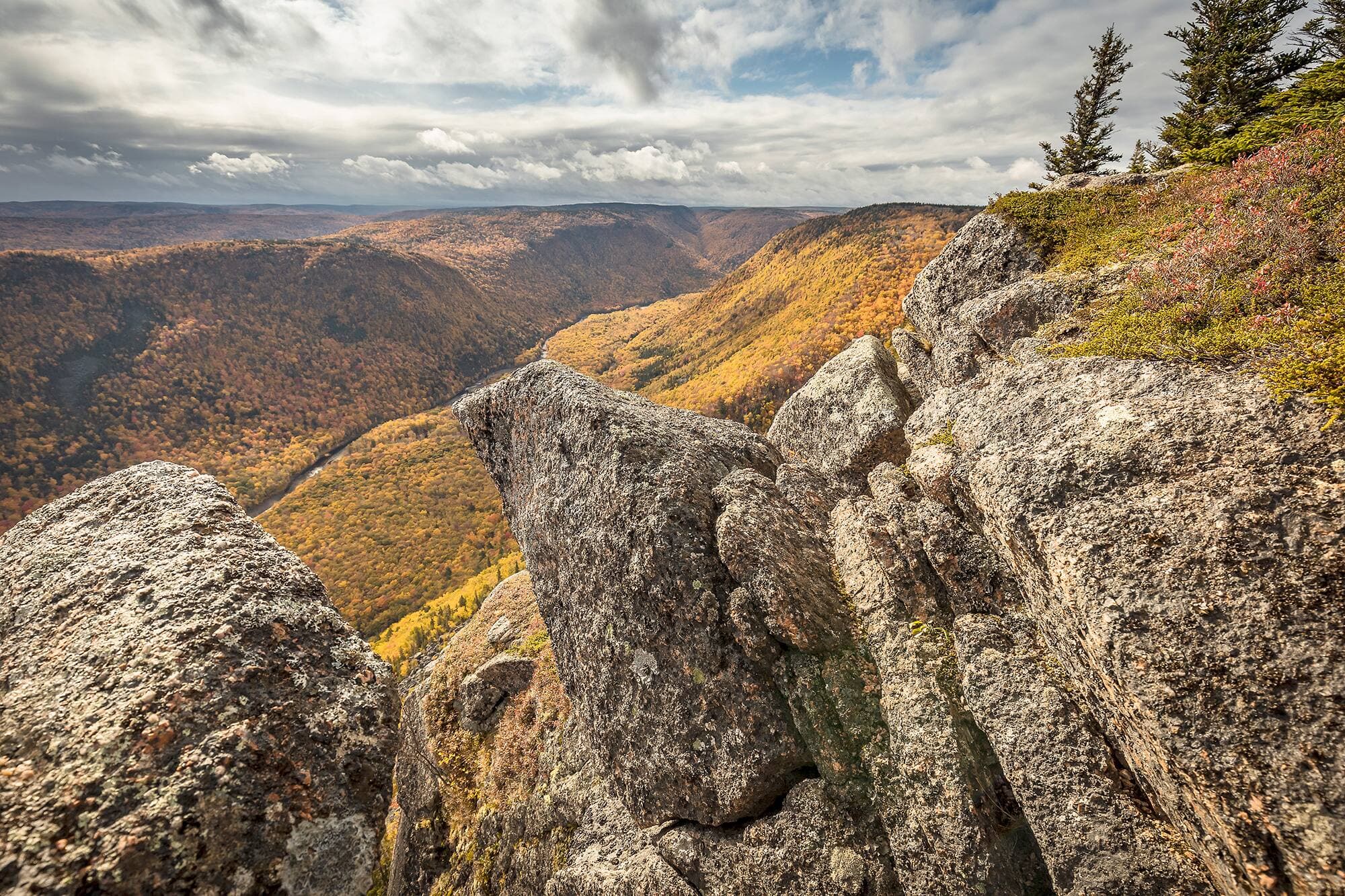 Parmi les plus beaux « road trips » du Canada, faire le tour des Hautes-Terres-du-Cap-Breton figure en haut du palmarès. Parcourir les 298 km de ce fabuleux trajet en automne offre une aventure inoubliable, croyez-moi ! Toutefois, garder les yeux sur la route exigera un effort. Le parc national des Hautes-Terres-du-Cap-Breton est bien connu pour ses randonnées en montagne et dans différents milieux, dont des tourbières dissimulées sur les hauts plateaux. Malgré le temps pluvieux, je décide de me dégourdir les jambes dans le sentier Franey. Non loin de la municipalité de Ingonish, je m’élance dans ce sentier de 7,4 km, de niveau modéré à difficile. Au fil de l’ascension, l’intensité des montées se fait rapidement oublier par la beauté du paysage forestier qui m’inonde de couleurs. Des érables aux écorces atypiques me transportent dans un monde presque fantastique. Une pluie fine m’accompagne jusqu’au sommet. Soudainement, les nuages laissent entrevoir quelques rayons de soleil. C’est sur un promontoire naturel perché à 425 mètres d’altitude que mon regard se perd vers l’Atlantique d’un côté, et dans les vallées de l’autre. À l’horizon, les panoramas sont époustouflants. Ils présentent des escarpements rocheux à donner le frisson et des canyons de rivières qui sillonnent les forêts luxuriantes à perte de vue. Curieux, j’emprunte un autre sentier plus discret. Celui-ci me mènera à une vue insoupçonnée, située à quelques dizaines de mètres plus loin...