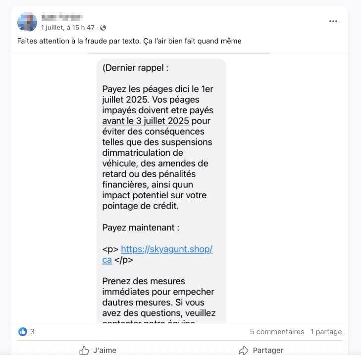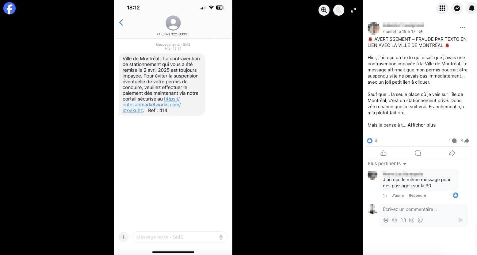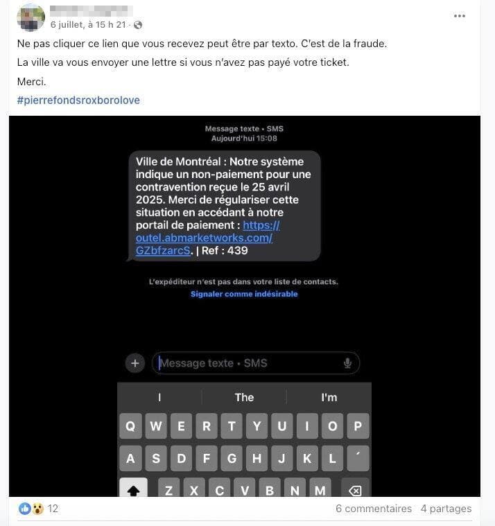 Cette résidente de L’Assomption, dans la région de Lanaudière, a roulé des yeux lorsqu’elle a reçu cette semaine un faux texto de la Ville de Montréal. Dans le message, les fraudeurs lui ordonnaient de payer une prétendue contravention de stationnement en cliquant sur un lien. Sinon, la cinquantenaire risquait de perdre son permis de conduire.