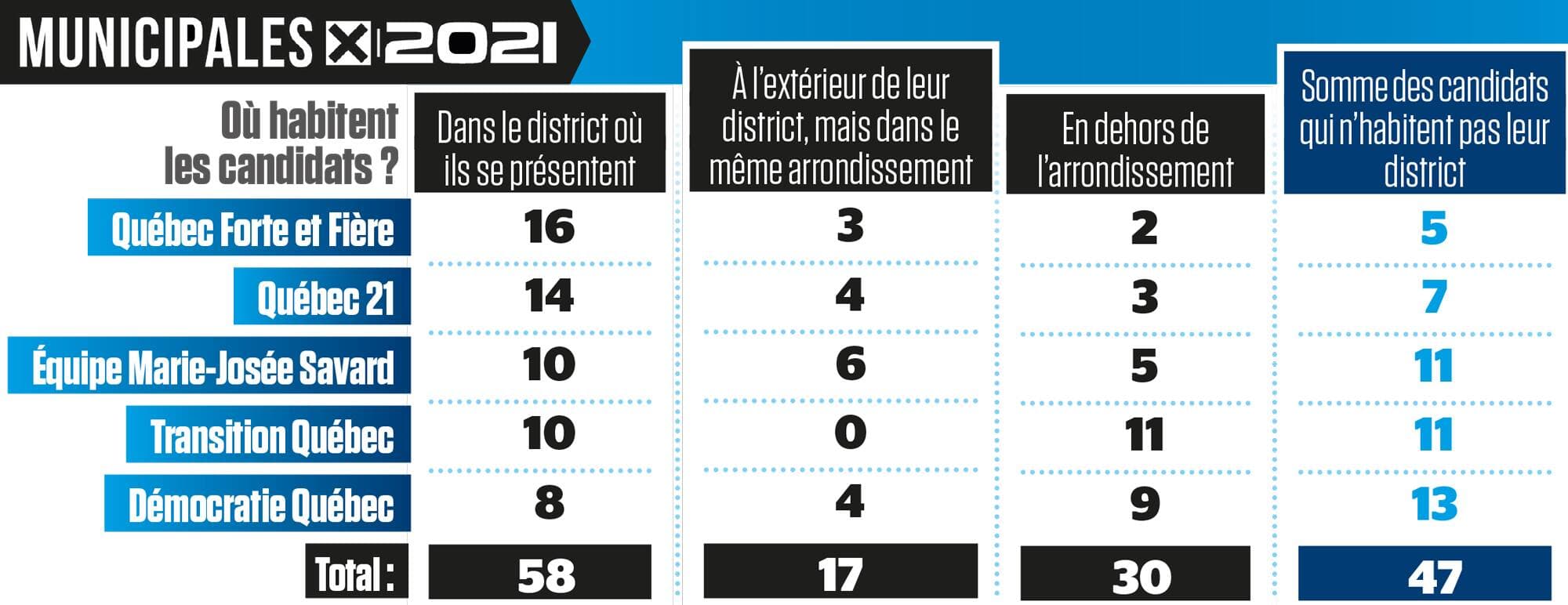 À Québec, seuls les partis Québec Forte et Fière (QFF) et Québec 21 sont parvenus à présenter une équipe de candidats dont au moins les deux tiers résident dans le district qu’ils veulent représenter.