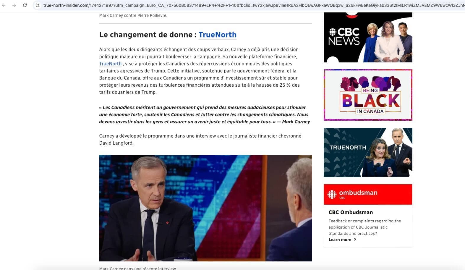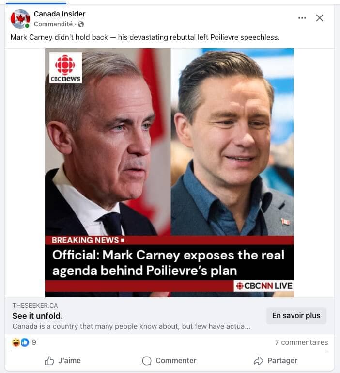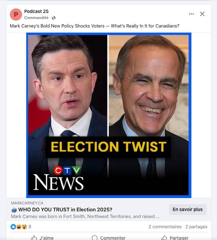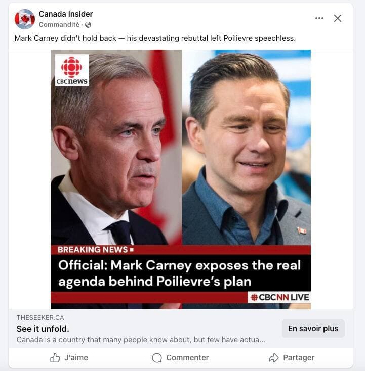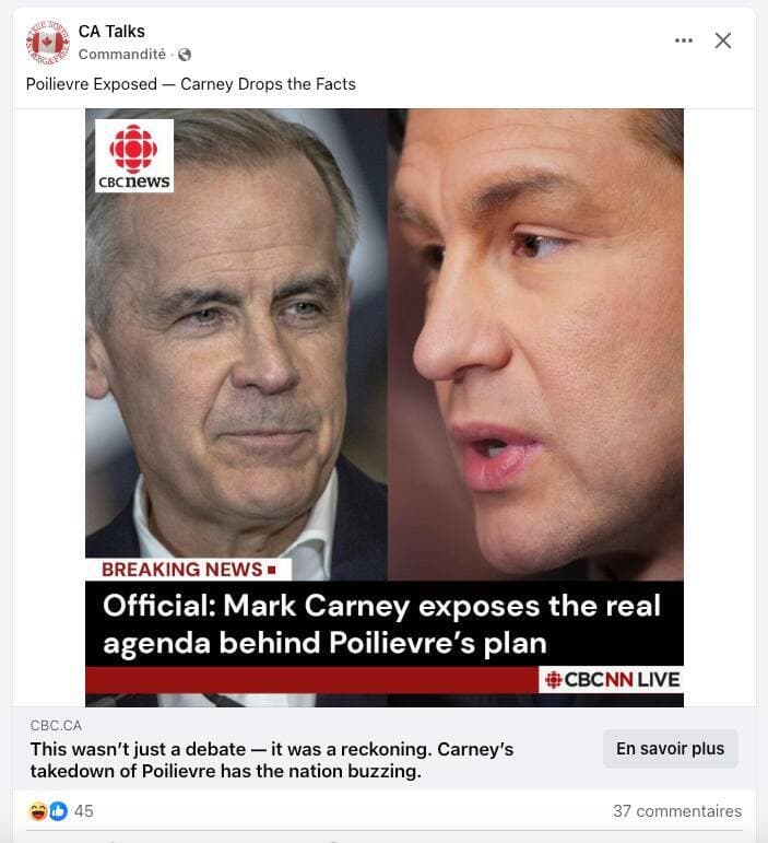 À deux semaines du jour du scrutin, Le Journal a trouvé des dizaines de fausses publicités du genre sur Facebook. Meta a par exemple encaissé de l’argent pour une pub mettant en vedette M. Carney qui aurait supposément «exaspéré Trump» avec une «nouvelle initiative». En cliquant sur celle-ci, on tombe sur un article attribué faussement à la CBC, le pendant anglophone de Radio-Canada.