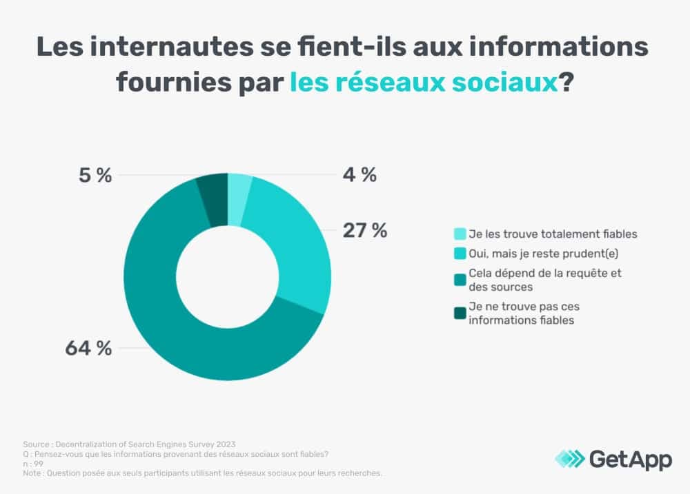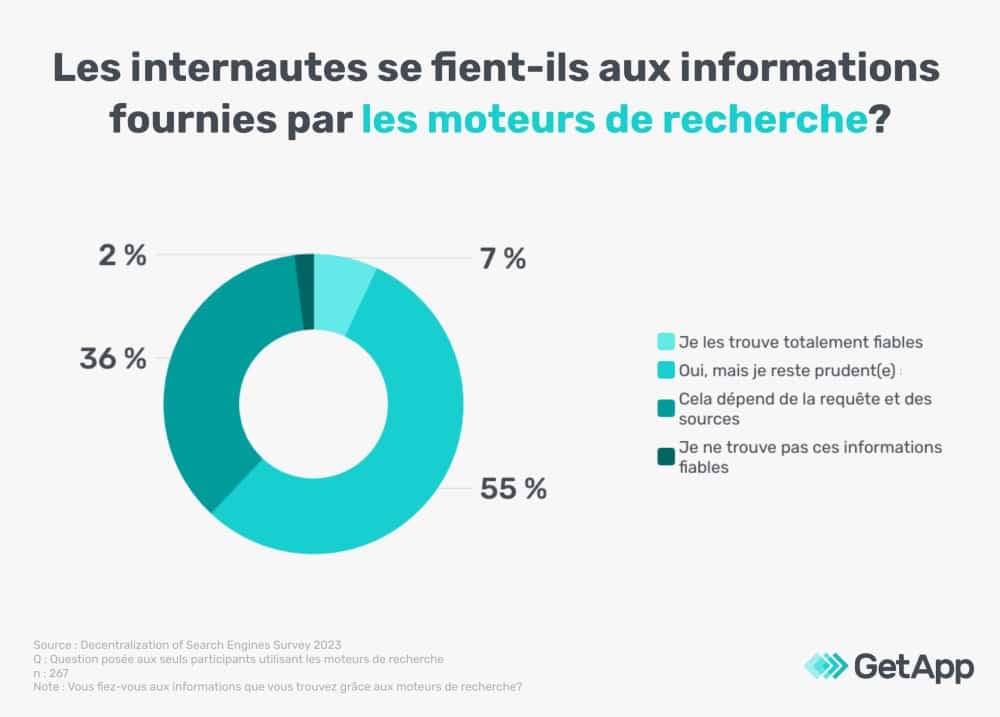 Cependant, seulement 7 % des personnes interrogées ont totalement confiance dans les informations obtenues via les moteurs de recherche, tandis que 55 % disent avoir confiance en général, mais restent prudentes, et 36 % déclarent que cela dépend de la requête et des sources.