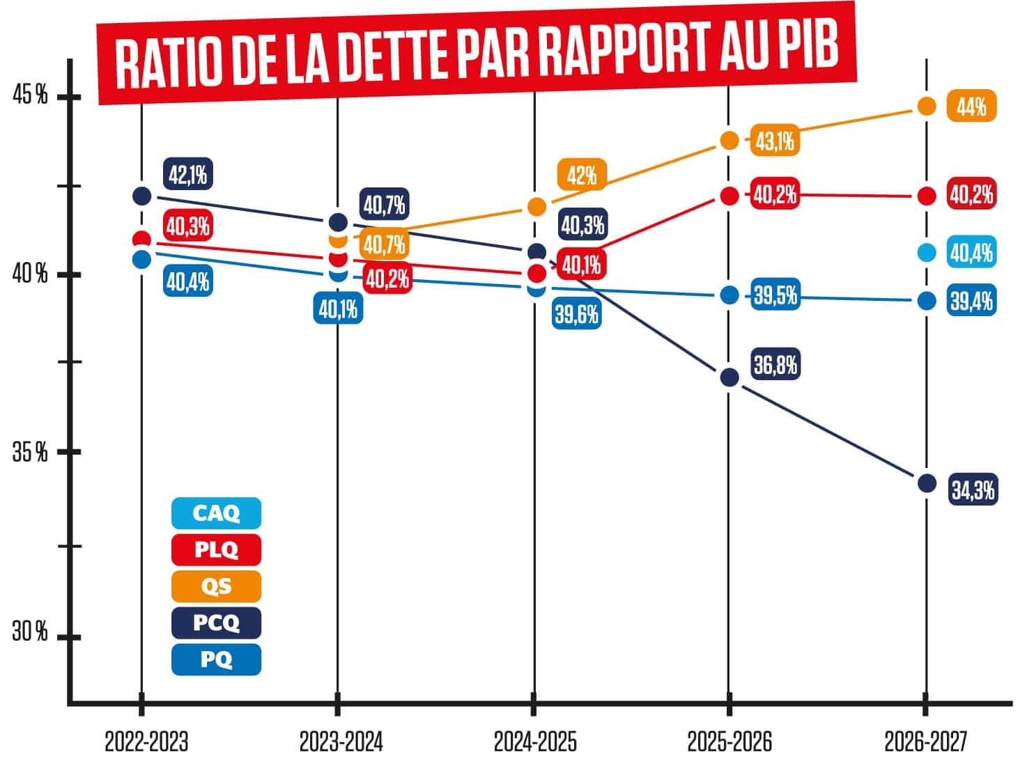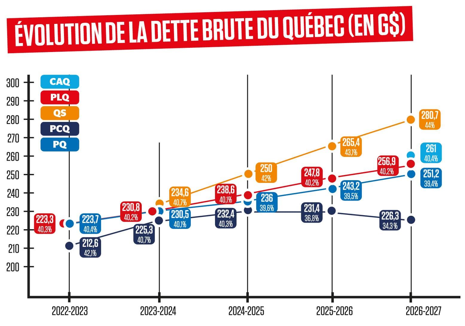 Avec un ratio dette/PIB à 44%, c’est sous un gouvernement de Québec solidaire que la dette du Québec serait la plus importante à la fin d’un premier mandat.