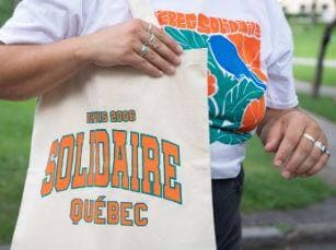 Il est désormais possible de s’offrir des articles aux couleurs des solidaires, que ce soit des chandails, des cotons ouatés, des sacs ou même des chaussettes.Si les cotons ouatés et les sacs sont bien fabriqués au Québec et composés de coton biologique et de matière recyclable, ce n’est pas le cas de tous les articles.