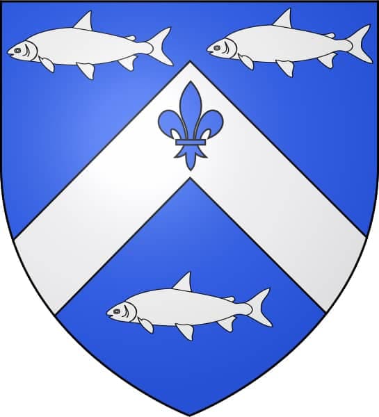 Trois-Rivières «D'azur au chevron d'argent chargé d'une fleur de lis du champ, accompagnés de trois poissons (grands corégones) nageant aussi d'argent.»