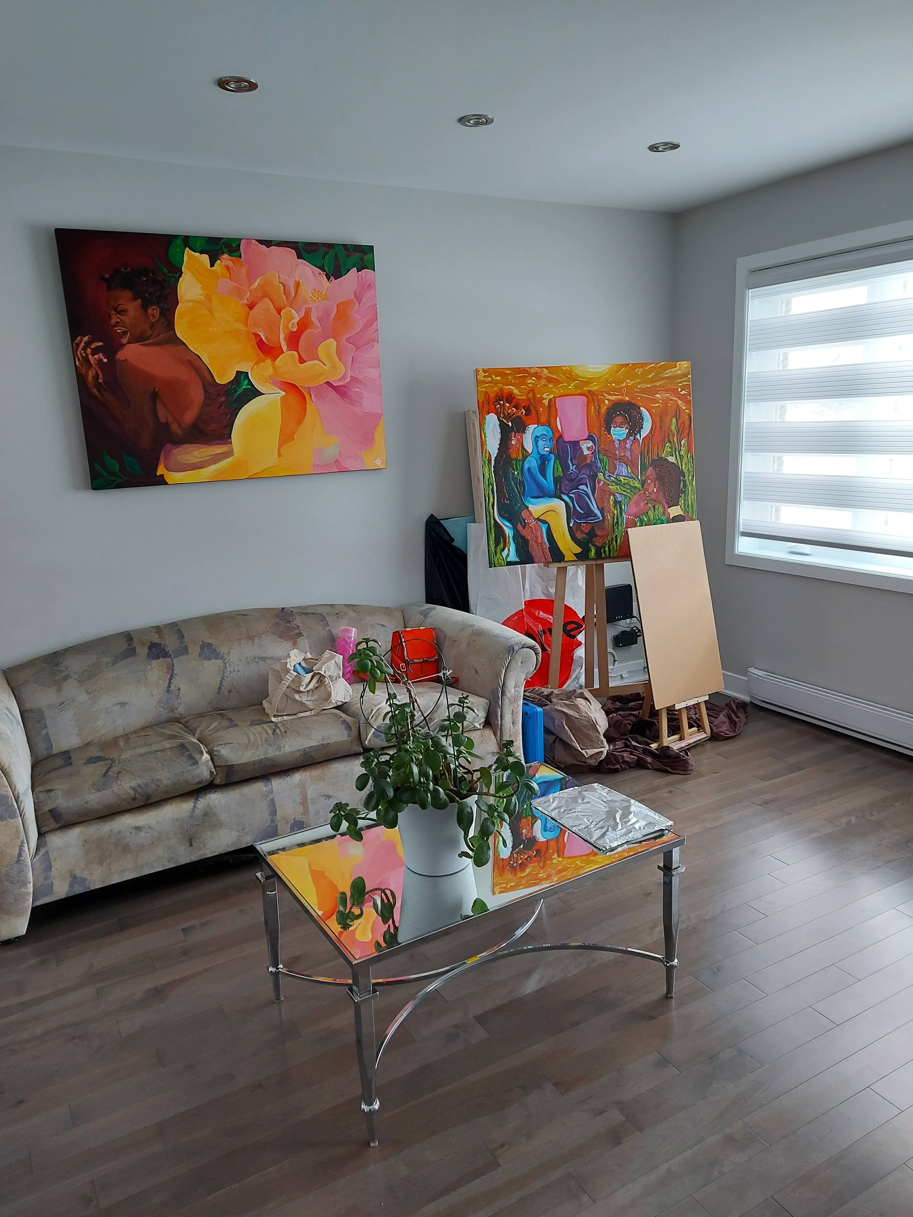 Rencontrée chez elle, entourée de ses toiles, Esther Calixte-Béa ne se gêne plus pour montrer des femmes noires velues, poilues et libérées dans ses œuvres.