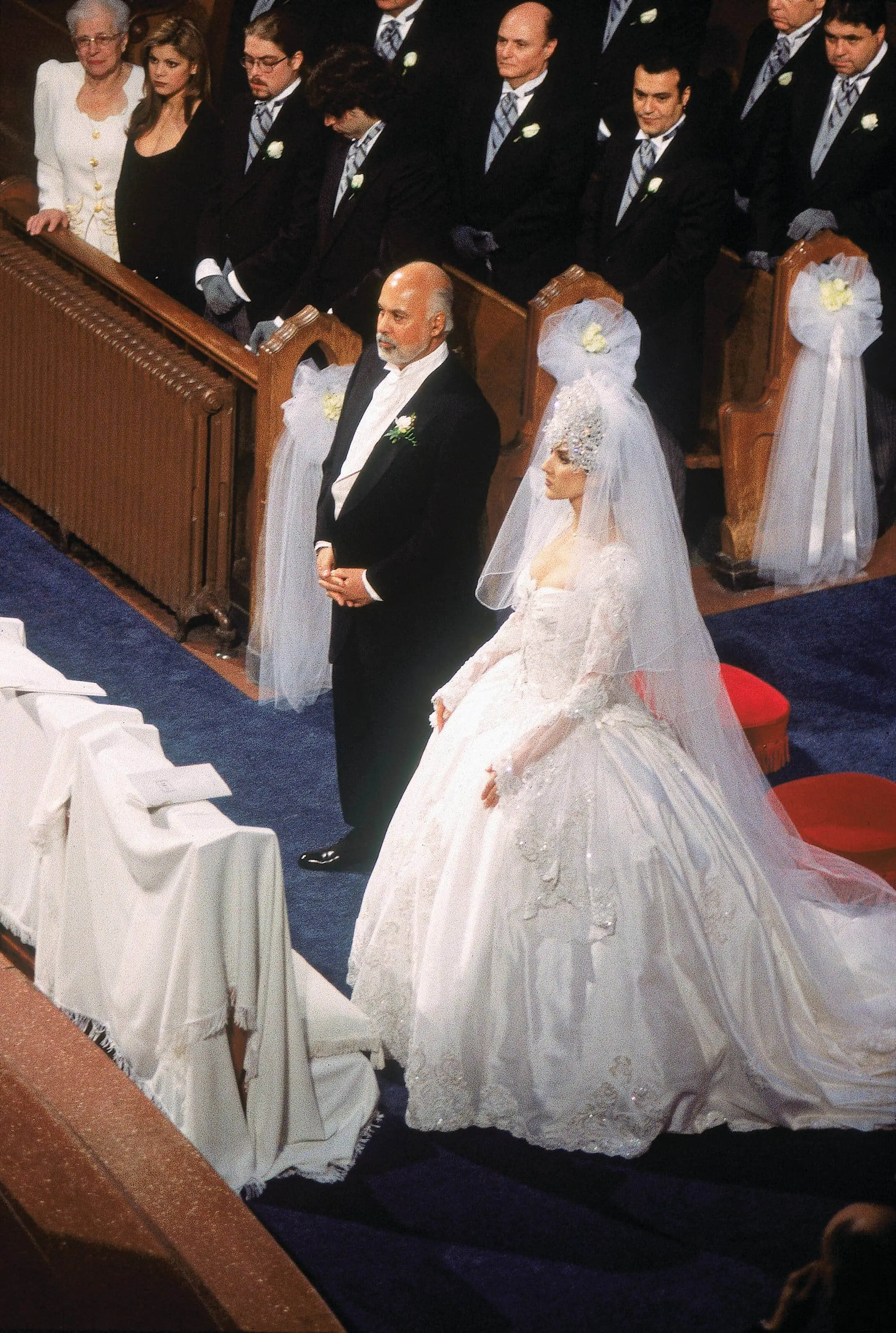 Mais plus que la robe, c’est l’imposant diadème que Céline portait sur la tête qui a marqué les esprits. Composée de 2000 cristaux Swarovski, la coiffe pesait près de 7 livres et avait dû être cousue dans les cheveux de la chanteuse pour bien tenir en place. D’ailleurs, la star a récemment révélé que le lendemain du mariage, elle avait dû consulter un médecin, car elle avait une énorme bosse sur le front en raison de son diadème. Elle a dû prendre des antibiotiques pendant trois semaines à cause de cette blessure crânienne.