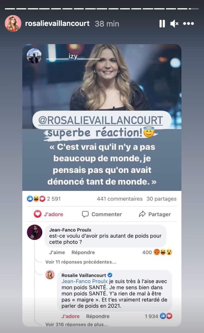 Rosalie Vaillancourt ne s'est pas gênée pour répliquer à un internaute qui lui avait envoyé un commentaire désobligeant sur son apparence physique.