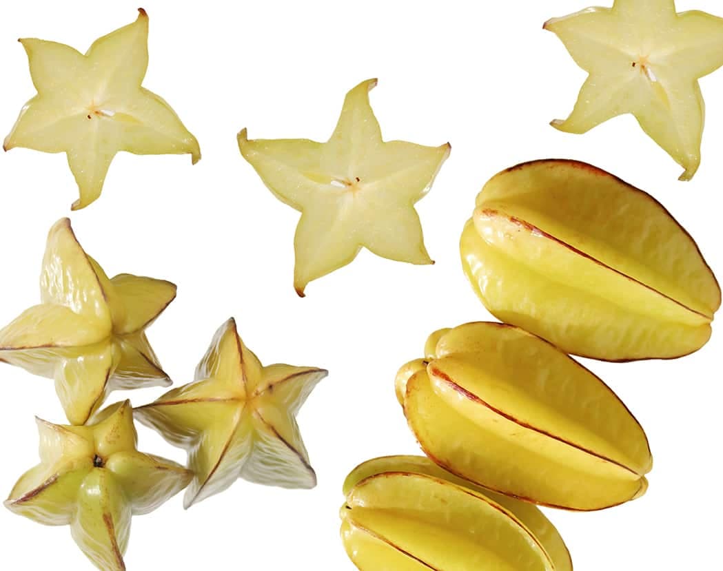 Carambole La carambole est un fruit tropical de forme ovale à cinq côtés, de couleur jaune à vert clair. Sa chair est juteuse, croquante et aigre-douce avec une légère saveur de pomme et de raisin, et est souvent utilisée dans les salades de fruits ou comme garniture pour les desserts. Personne ne sait comment manger ça.