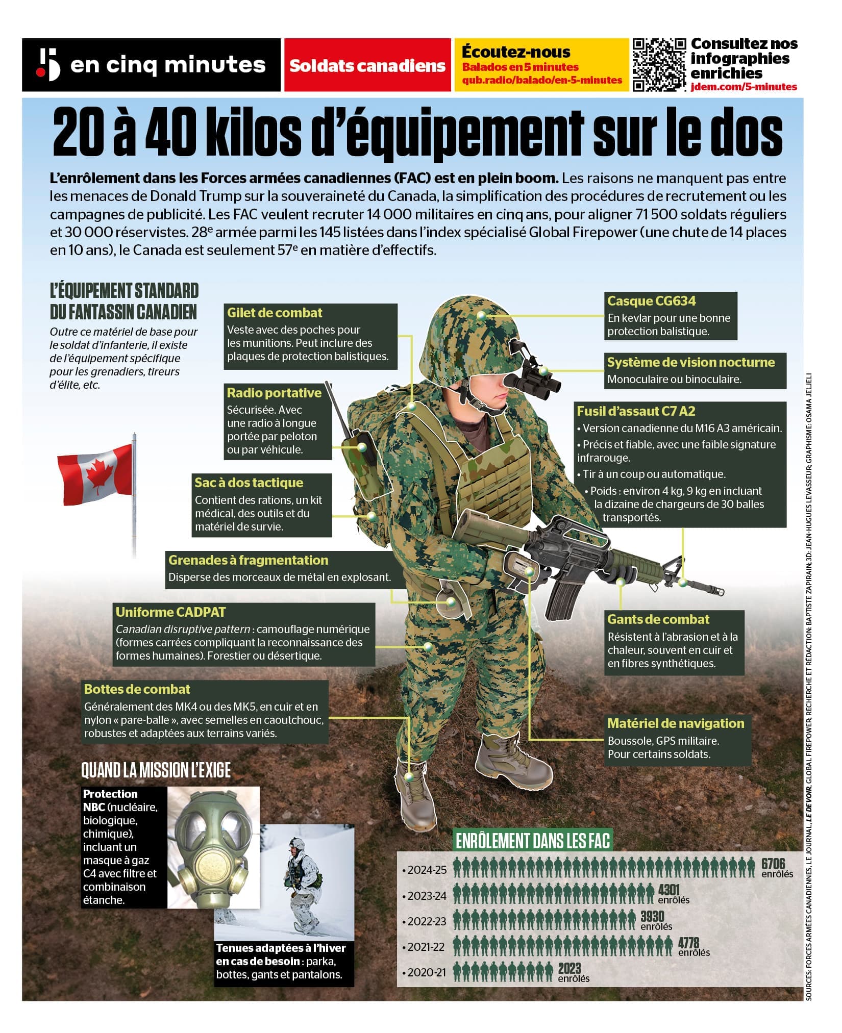 Les raisons ne manquent pas entre les menaces de Donald Trump sur la souveraineté du Canada, la simplification des procédures de recrutement ou les campagnes de publicité. Les FAC veulent recruter 14 000 militaires en cinq ans, pour aligner 71 500 soldats réguliers et 30 000 réservistes. 28e armée parmi les 145 listées dans l’index spécialisé Global Firepower (une chute de 14 places en 10 ans), le Canada est seulement 57e en matière d’effectifs.