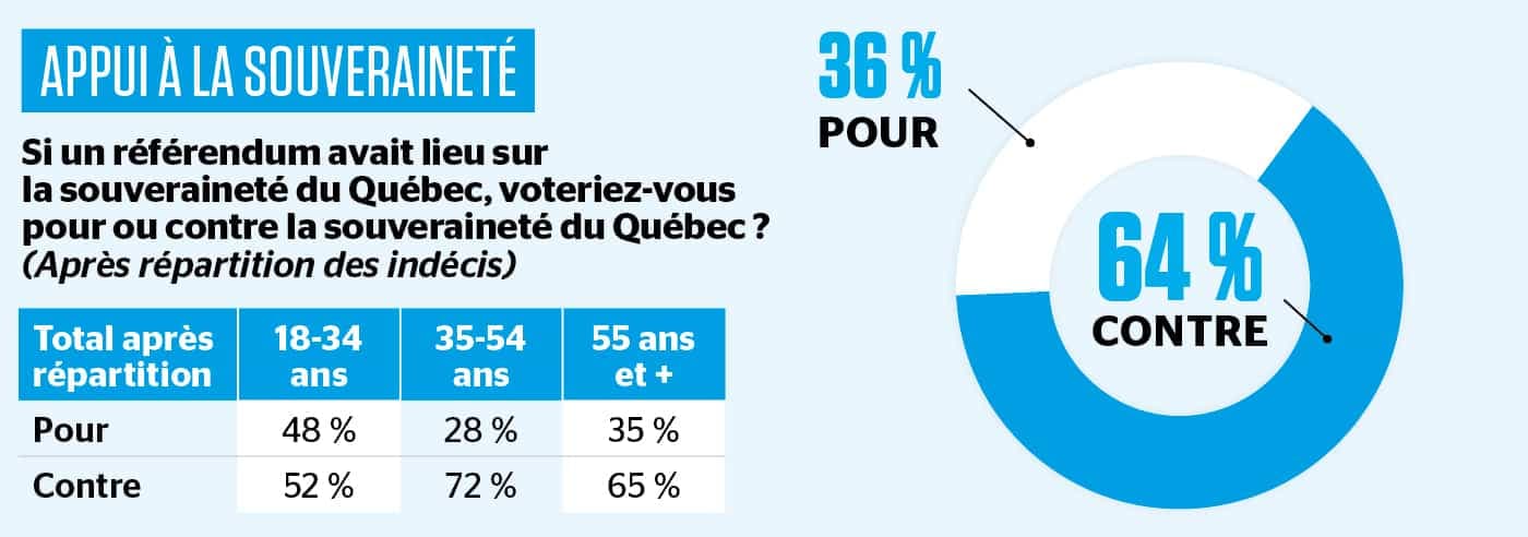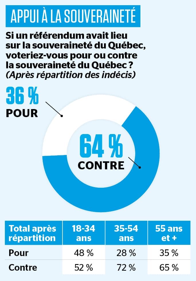 Mais chez les jeunes de 18 à 34 ans, l’aiguille bouge. Pas moins de 48% des Québécois de cette tranche d’âge sont séduits par l’idée d’indépendance, c’est presque 20% de plus qu’il y a un an.