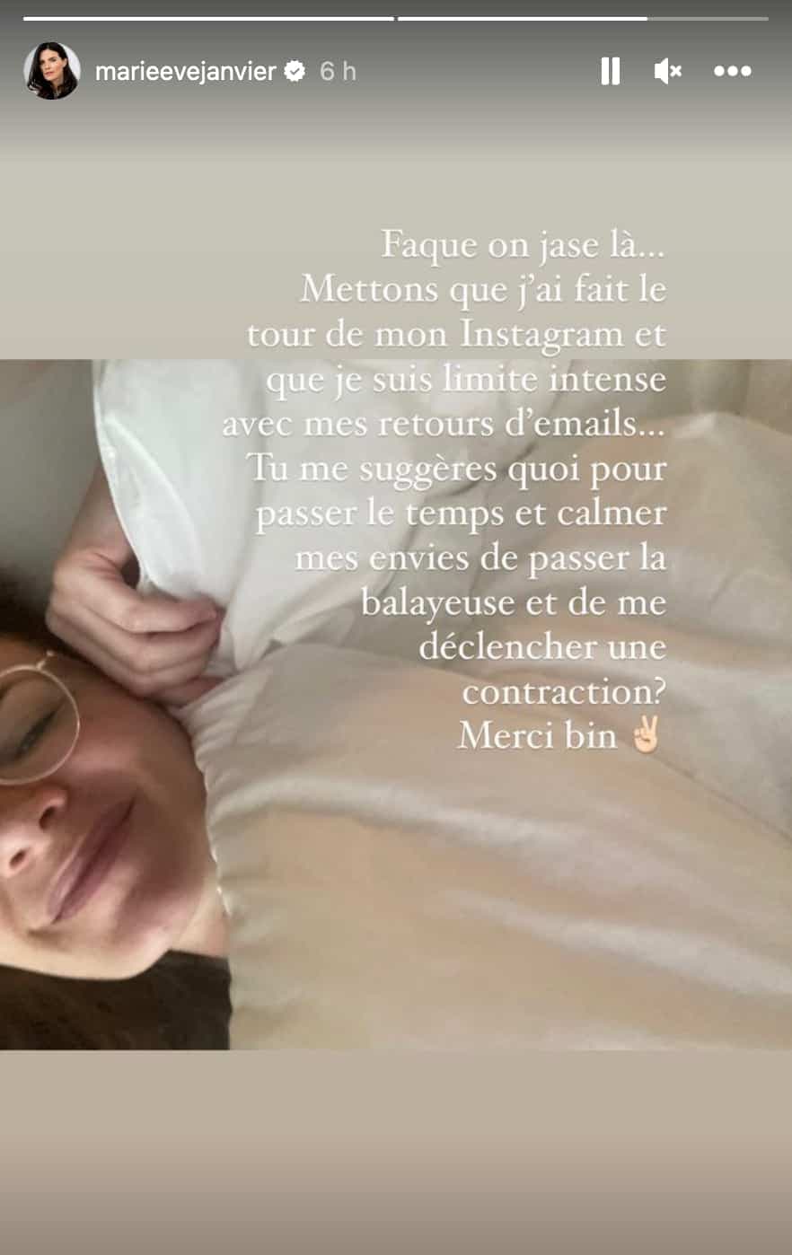 «Faque on jase là...Mettons que j'ai fait le tour de mon Instagram et que je suis limite intense avec mes retours d'emails.Tu me suggères quoi pour passer le temps et calmer mes envies de passer la balayeuse et de me déclencher une contraction? Merci bin», demandait-elle à sa communauté avec un brin d’humour et de légèreté.