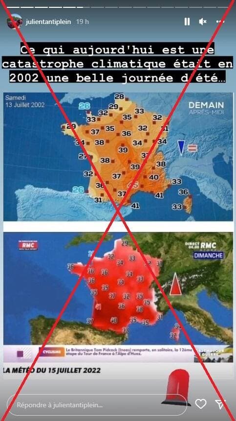 En France deux cartes, censées prouver que les médias veulent intentionnellement faire «peur» avec la canicule de 2022, ont été partagées plusieurs milliers de fois sur les réseaux sociaux depuis le 15 juillet.