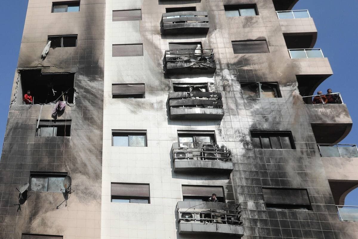 L'agence de presse officielle Sana a diffusé des photos présentées comme des dégâts à la suite de la frappe, montrant un immeuble en partie calciné et les fenêtres brisées, avec des flammes s'élevant d'un des appartements.