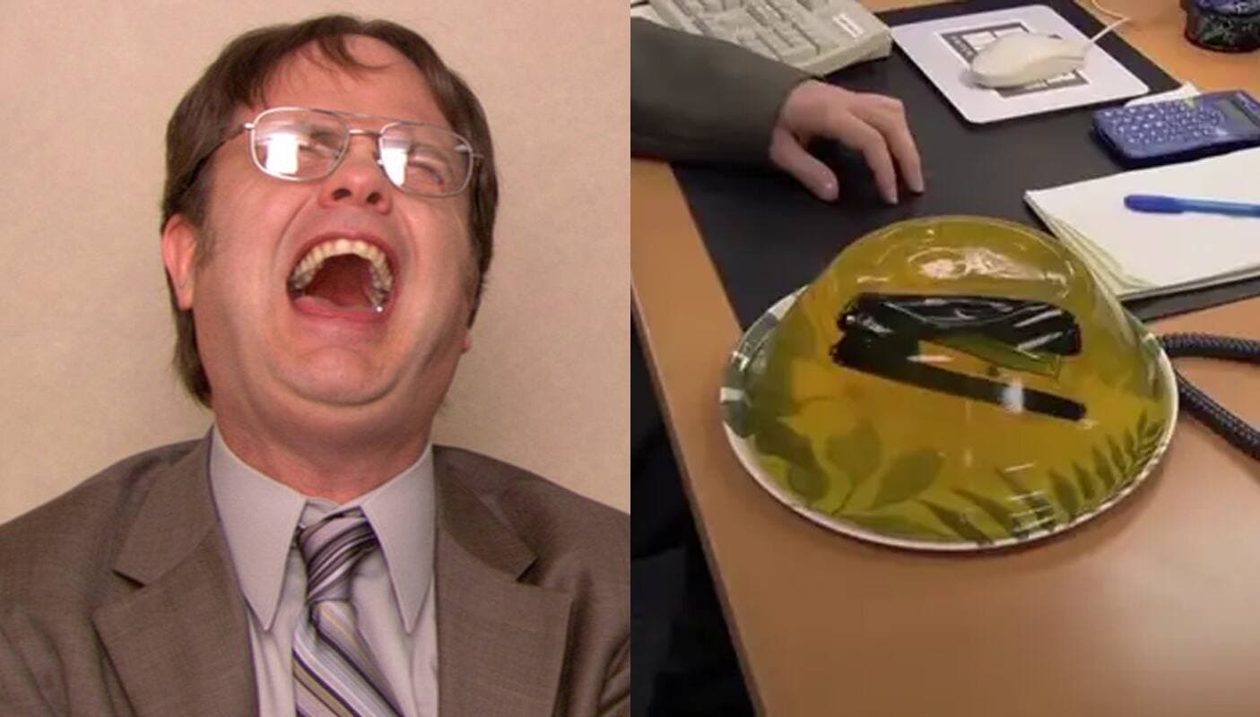 Dans le tout premier épisode de The Office, Dwight, incarné par Rainn Wilson, se fait jouer un tour par Jim (John Krasinski), qui met son agrafeuse dans du Jell-O. C’est la blague qui lance la rivalité entre Dwight et Jim, qui durera durant neuf saisons.